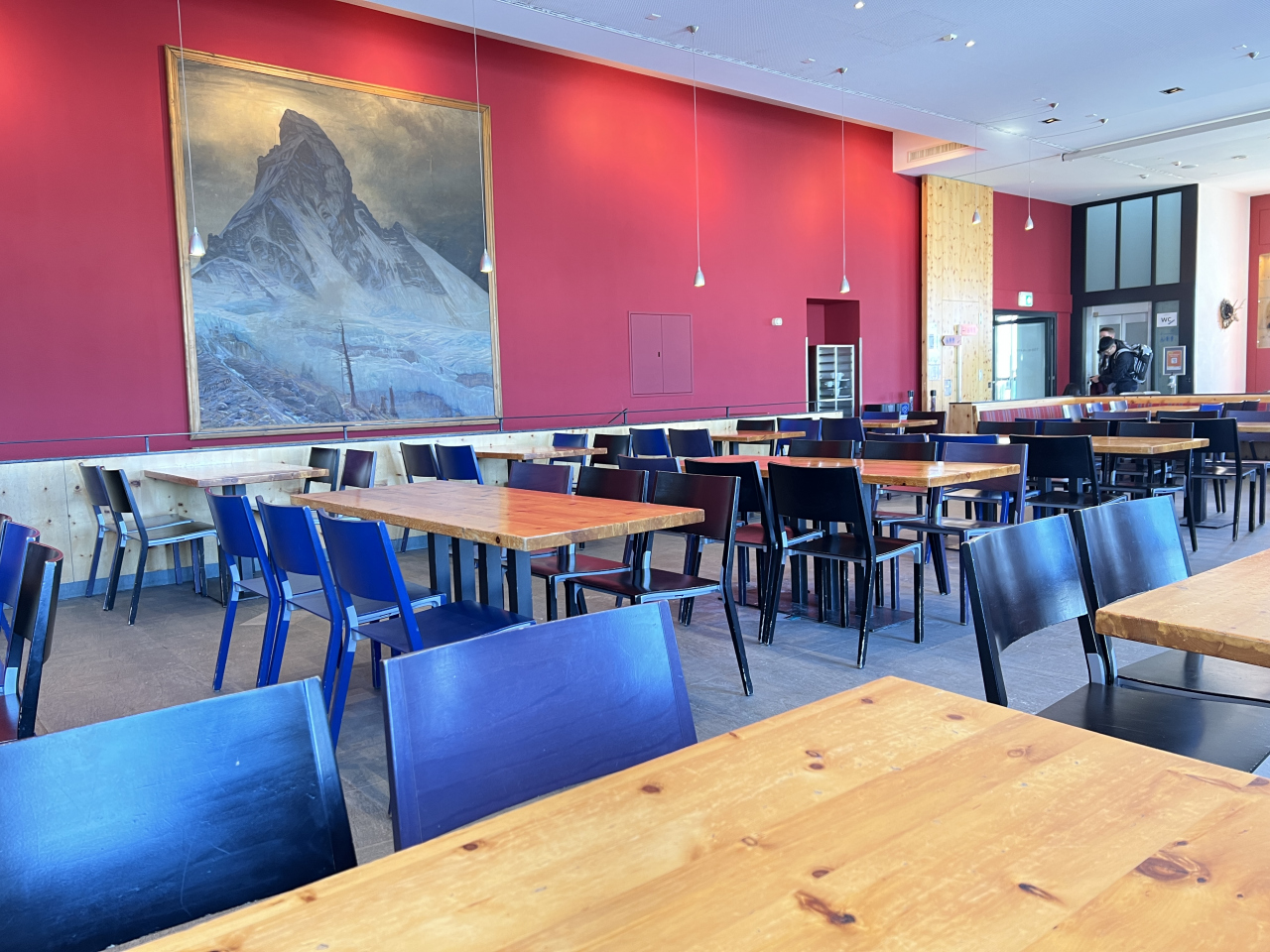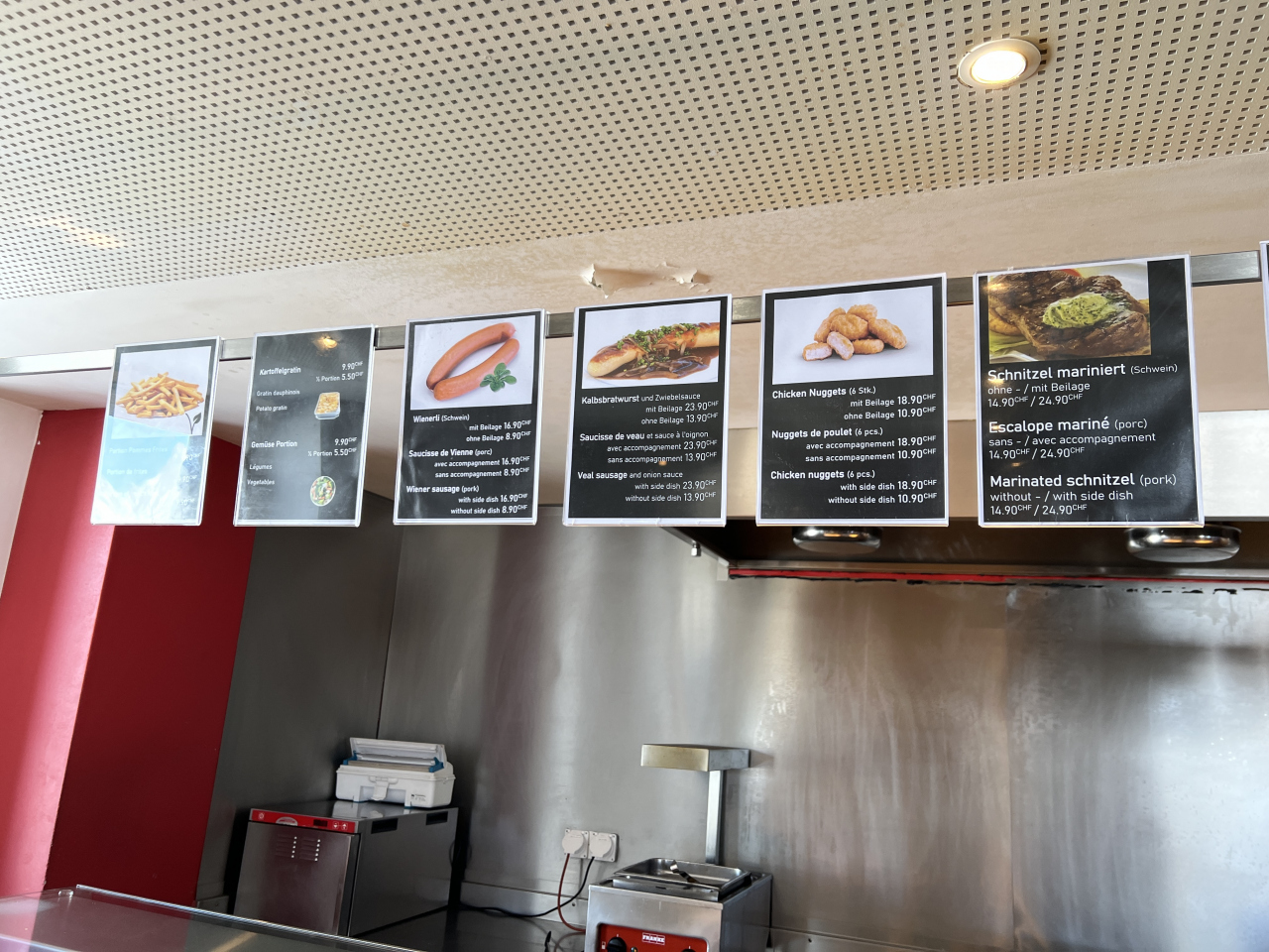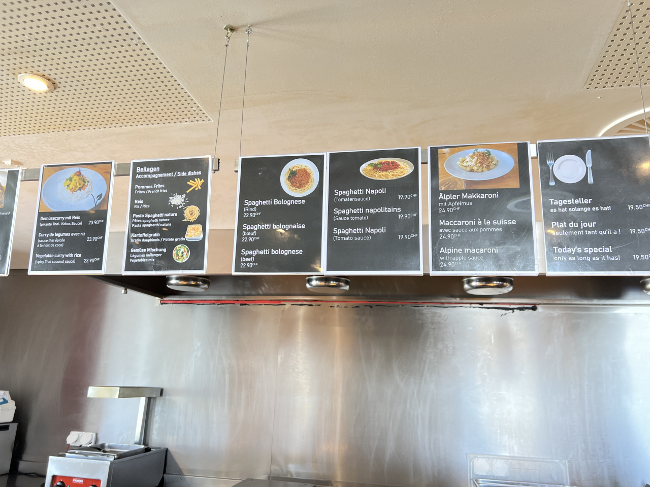 セルフのカフェ。注文するカウンターの上に写真付きでメニュがあります。ソーセージ、パスタ、チキンナゲット、豚肉のシュニッツェルなど。ドイツ語、フランス語、英語の表記があるので楽。私は、仔牛のソーセージで野菜の付け合わせ付きを食べました。大変美味ですね。付き合わせの野菜も美味しい。雰囲気はとても良いです。テーブルは木製。地元の人らしい人、働いている人も食べに来ていました。混んではいませんでした。