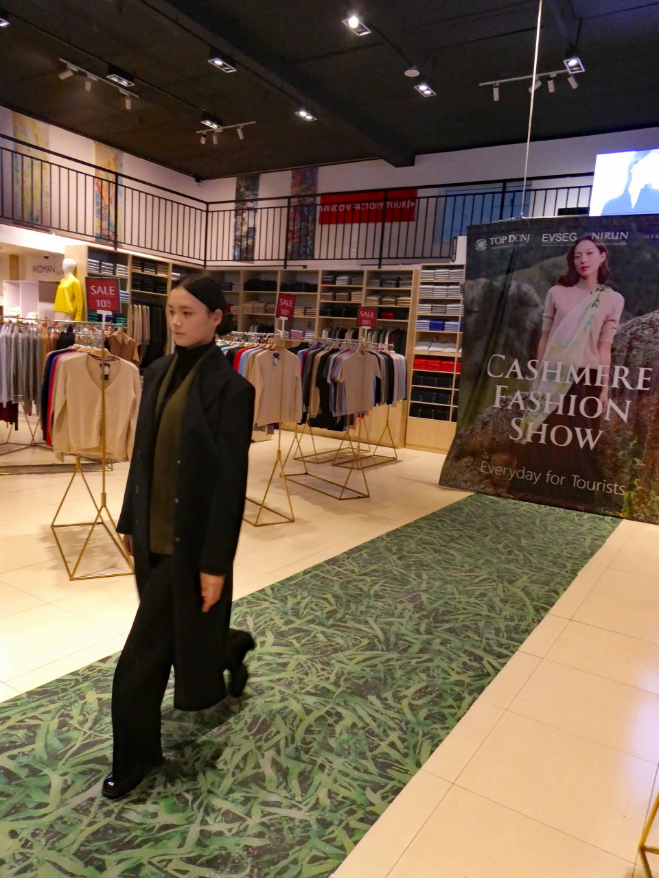 ボグドハーン宮殿博物館の南側にあるカシミア製品の工場付属の直売所です。「カシミアやヤクの毛織物なら、この店がお勧め」との現地ガイドさん紹介で訪問しました。平屋売り場は複数ブロックに分かれ、多種類の毛織物製品が並べられており、フィッティング・ルームも揃っていました。お店を入った個所に細長のカーペットが敷かれており、「何かな?」と思っていたら、突然ファッション・ショーが始まり、細身のモデルさんが毛織物製品を纏ってカーペットを行き来しました。驚かされました。海外観光客が多いお店で、店前に観光バスが停車していました。