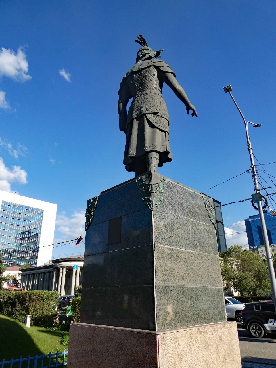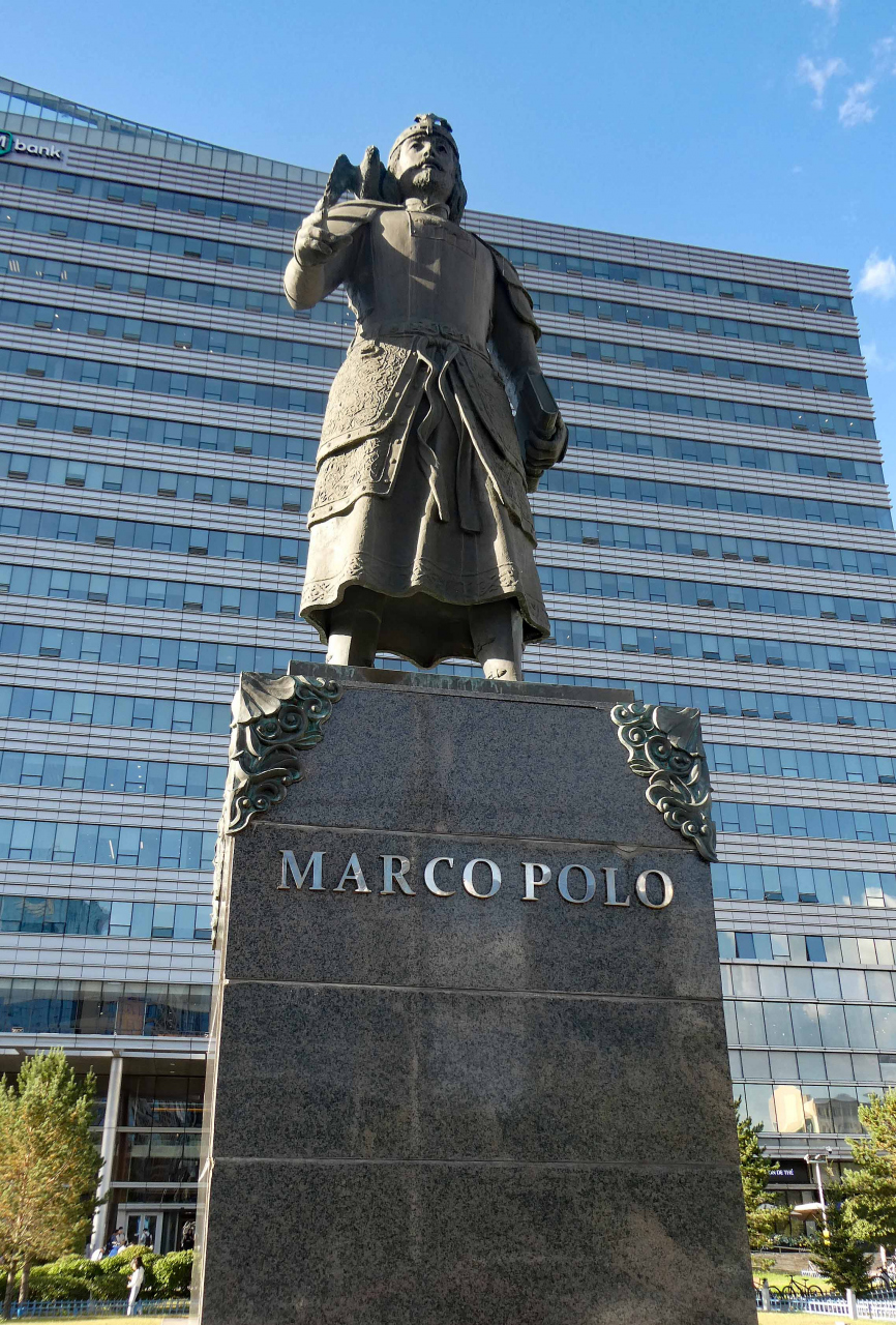 マルコ・ポーロは、モンゴル帝国のフビライハーン(1215-1294)の時代に、何度か出生地ベネチアとモンゴルを行き来しています。モンゴルと西欧との交流を記念して建てられたようです。マルコ ポーロは商人姿ではなく、西欧風の鎧を纏って肩に狩猟用のハヤブサを乗せた凛々しい姿です。