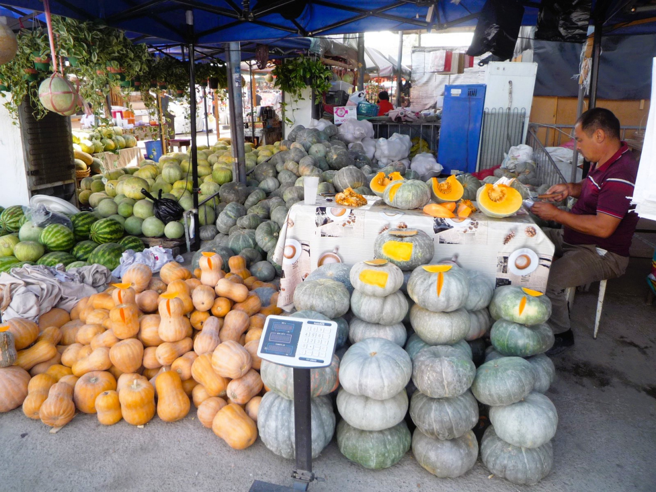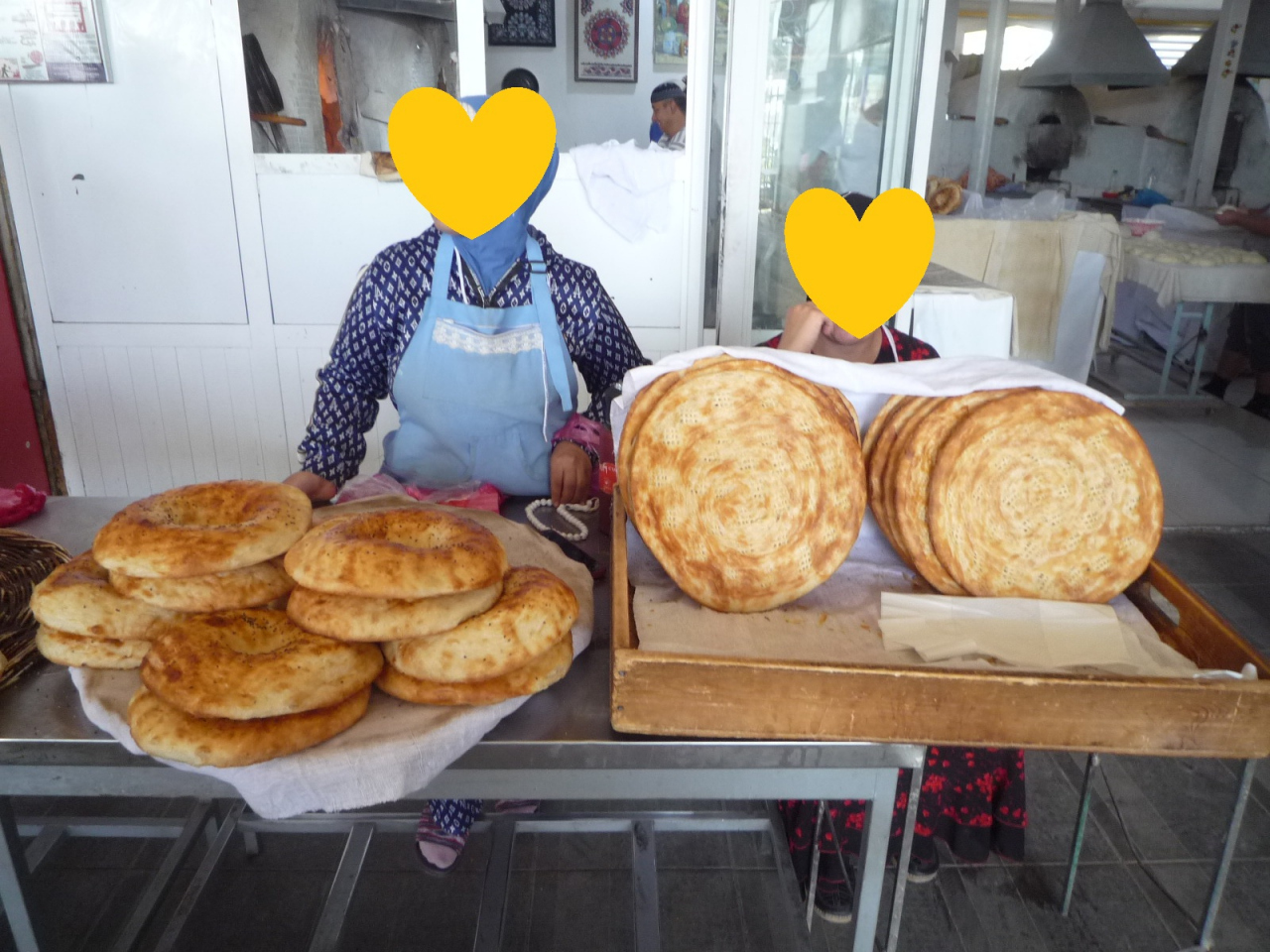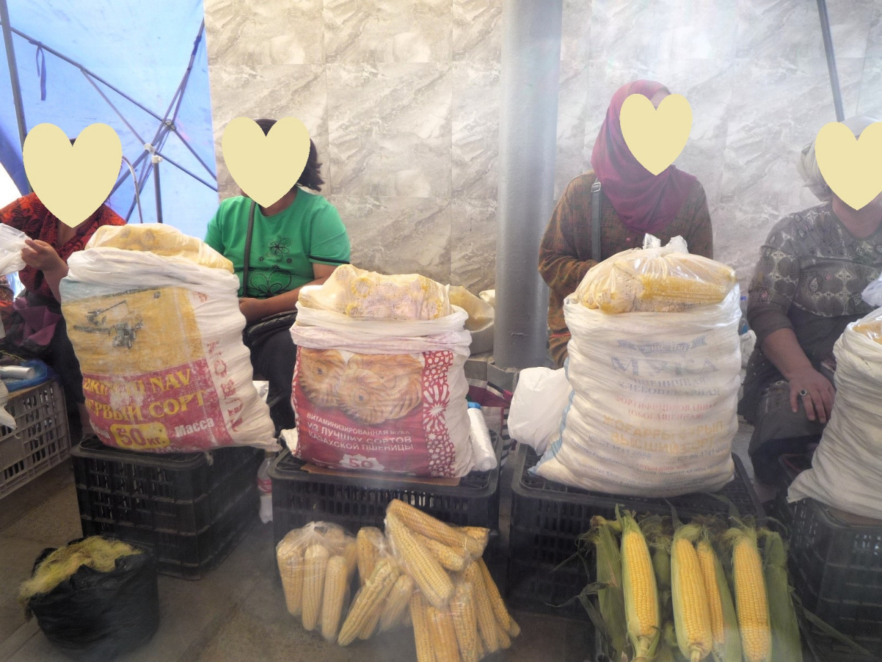 宿で美味しかったメロン試食、店によって微妙に味が違う。ゆでたトウモロコシ5,000スム(約61円)、大きいナン5,000スム(約61円)を購入。
