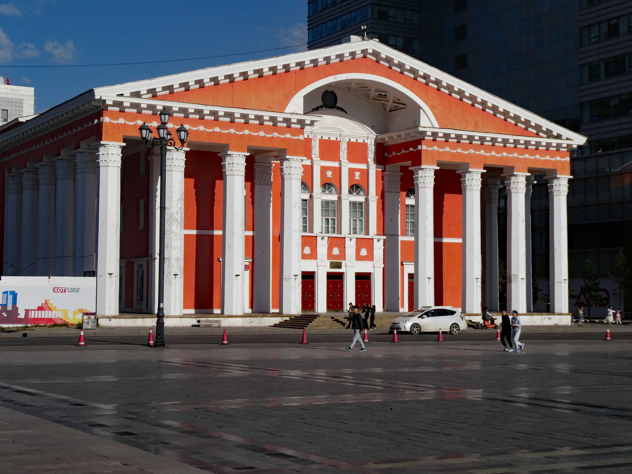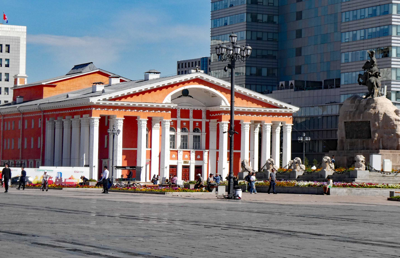 スフバートル広場の東側にあり、赤色壁と白色柱のコントラストが美しい建物で、ヨーロッパで見かけるオペラハウスに似ています。ウランバートル滞在中に、この建物前を何度か行き来しました。2025年8月下旬、公演は行われていないようでした。