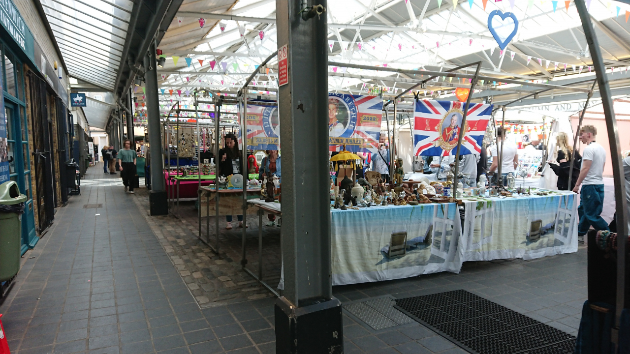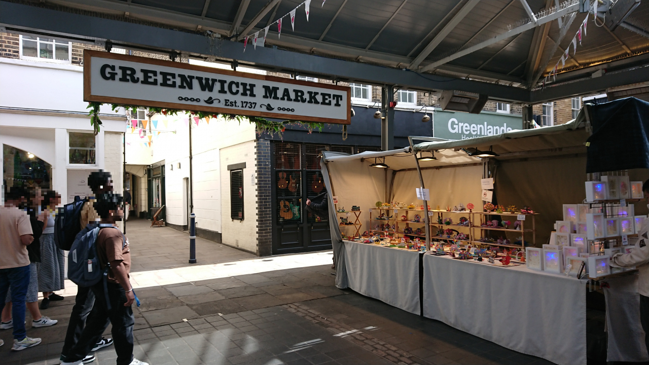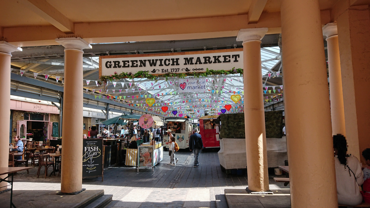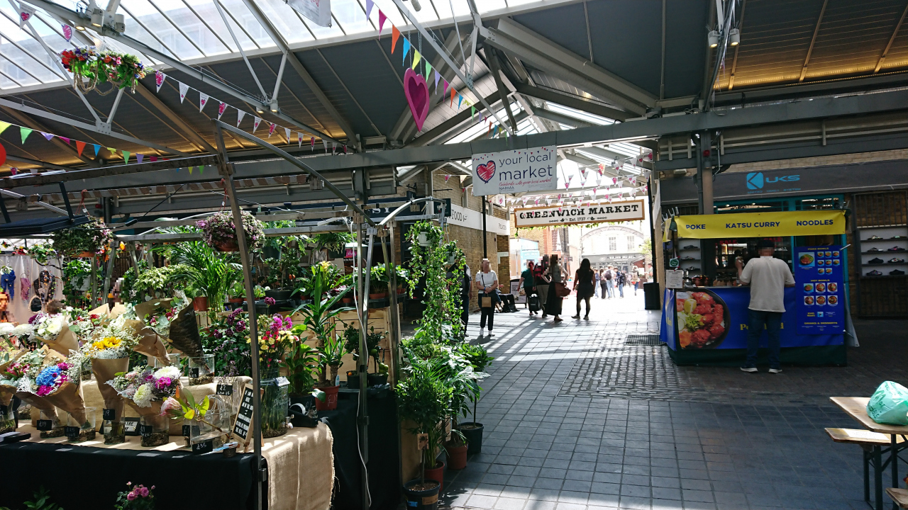 Eventの無い平日に訪れたのでお昼時でもグリニッジの街自体が静かだった。グリニッジ・マーケットも同様で屋台ブースの出店数も少なかったし、買い物客の賑わいと言った喧噪とは無縁で、落ち着いた雰囲気だった。以前に訪れた時はごった返していたので、マーケットもこんなに静かな時があるんだな、と認識を新たにした。
