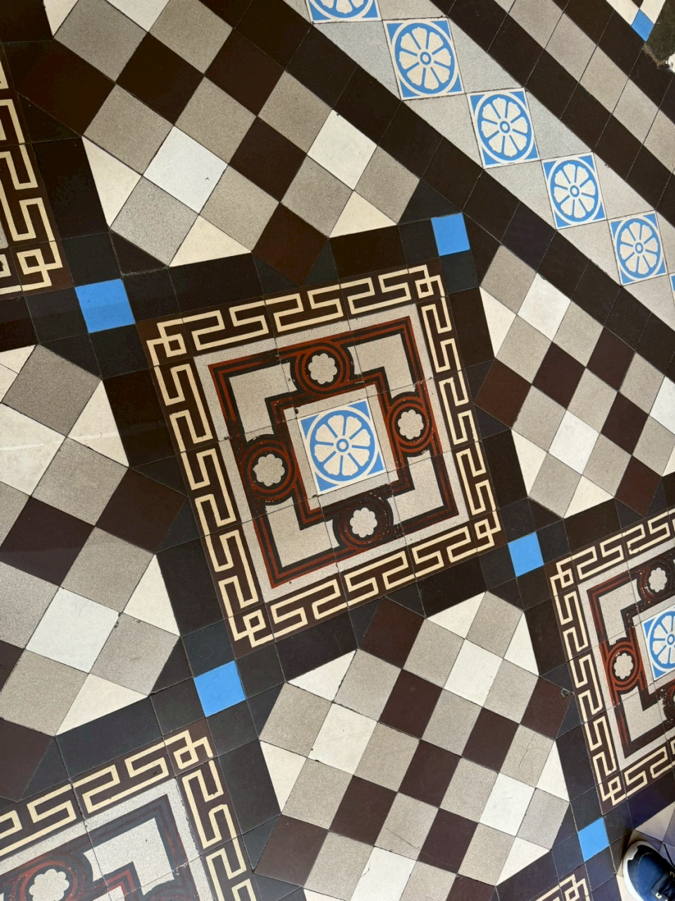 アーチ型の天井、タイル張りの床面模様が特徴的で綺麗です。