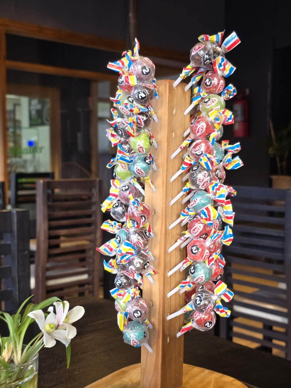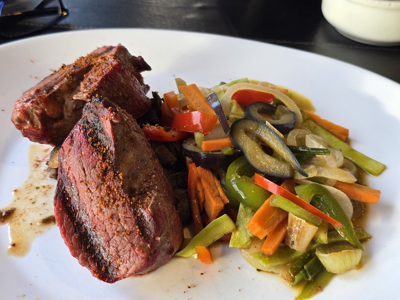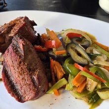 前回訪れた時には軽食だけだったのですが、今回は夕食に利用しました。肉、魚、パスタのメニューからお店の名前がついた肉料理を選択。焼き加減、炭の香りが最高で、ビールとともにおいしくいただきました。会計時に選べるキャンディーも以前と同じでした。