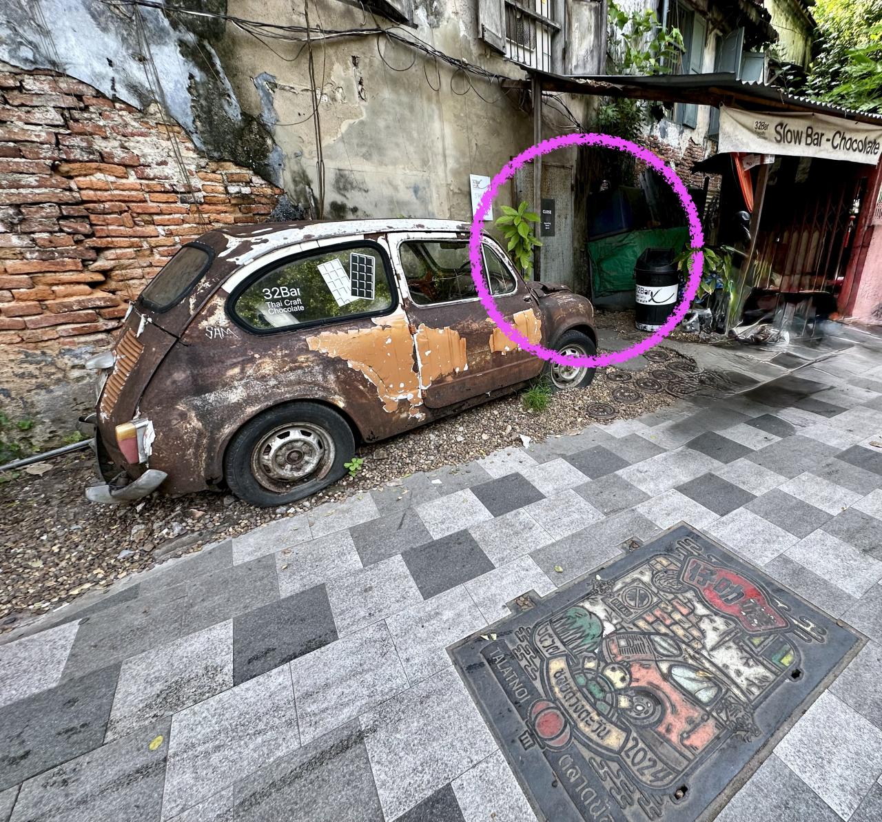 さて、この「タラート・ノイの中心地」…というか、最もそれを象徴するスポットが、もう動かなくなってしまったボロい、色の禿げた「フィアット」が、これまたボロボロの廃屋の前に無造作に置いてある場所である…ここが凄く映えるので、ここを目指して多くの観光客が集まって来ると言っても過言ではない。