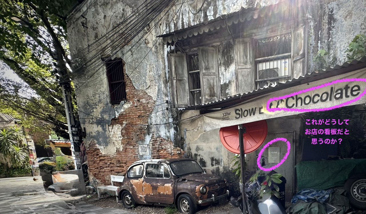 その上に掲げられているボロボロの横断幕には、確かによく見ると「チョコレート云々」と汚らしく描き殴られているのだが、まさかそれがこのお店の看板だったとは…想像も付かなんだ…