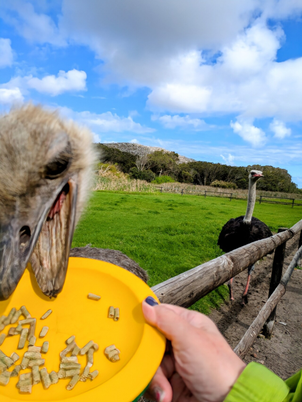 飼育されてるダチョウに餌をやる事が出来るとガイドさんに言われ、手のひらに餌を載せてダチョウのもとへ。と、いきないガバッと嘴で挟まれ、手の甲を擦り剥きました。歯は無いので噛みつかれた訳では有りませんが、吃驚しました。以降は餌を皿に載せて与えましたが、それでも迫って来る力は半端無く。良い経験になりました。
