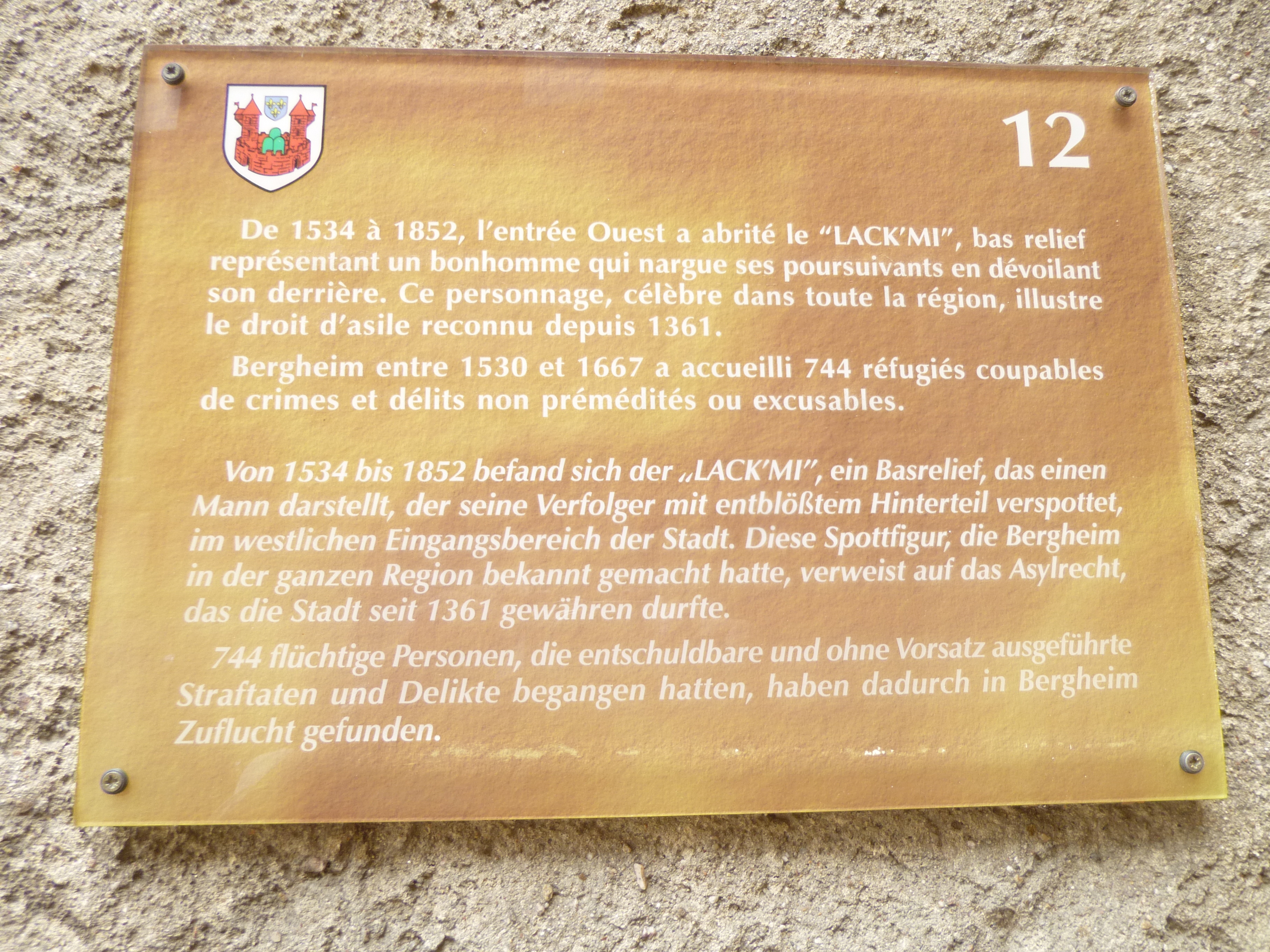 「1534年から1852年まで、「LACK'MI」(彼のお尻を丸出しにして、追いかける敵をあざける男を表現した)の浅浮き彫りが掲げられていた。当時、浅浮き彫りはベルクハイム村の西の入口にあったそうです。