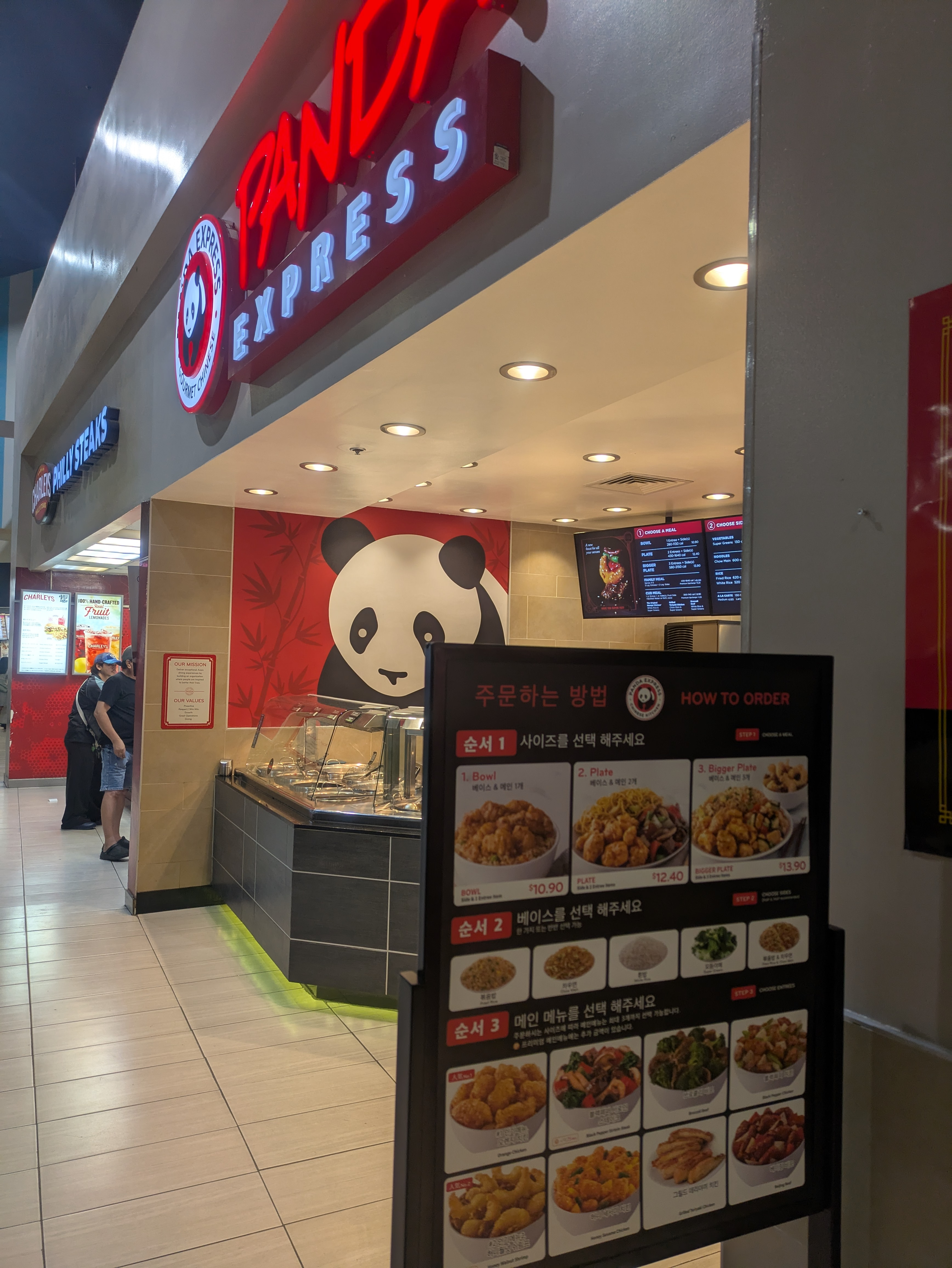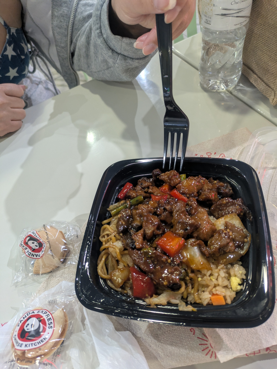 今回チョイスしたのは「パンダボウル」。ベースメニュー(主食)はフライドライスと炒麺のハーフ&ハーフに決めました。メイン(主菜)はブラックペッパーステーキ。トータル13ドル弱です。1人だと食べきれないけど、娘とシェアだとちょっと足りない感じでした。