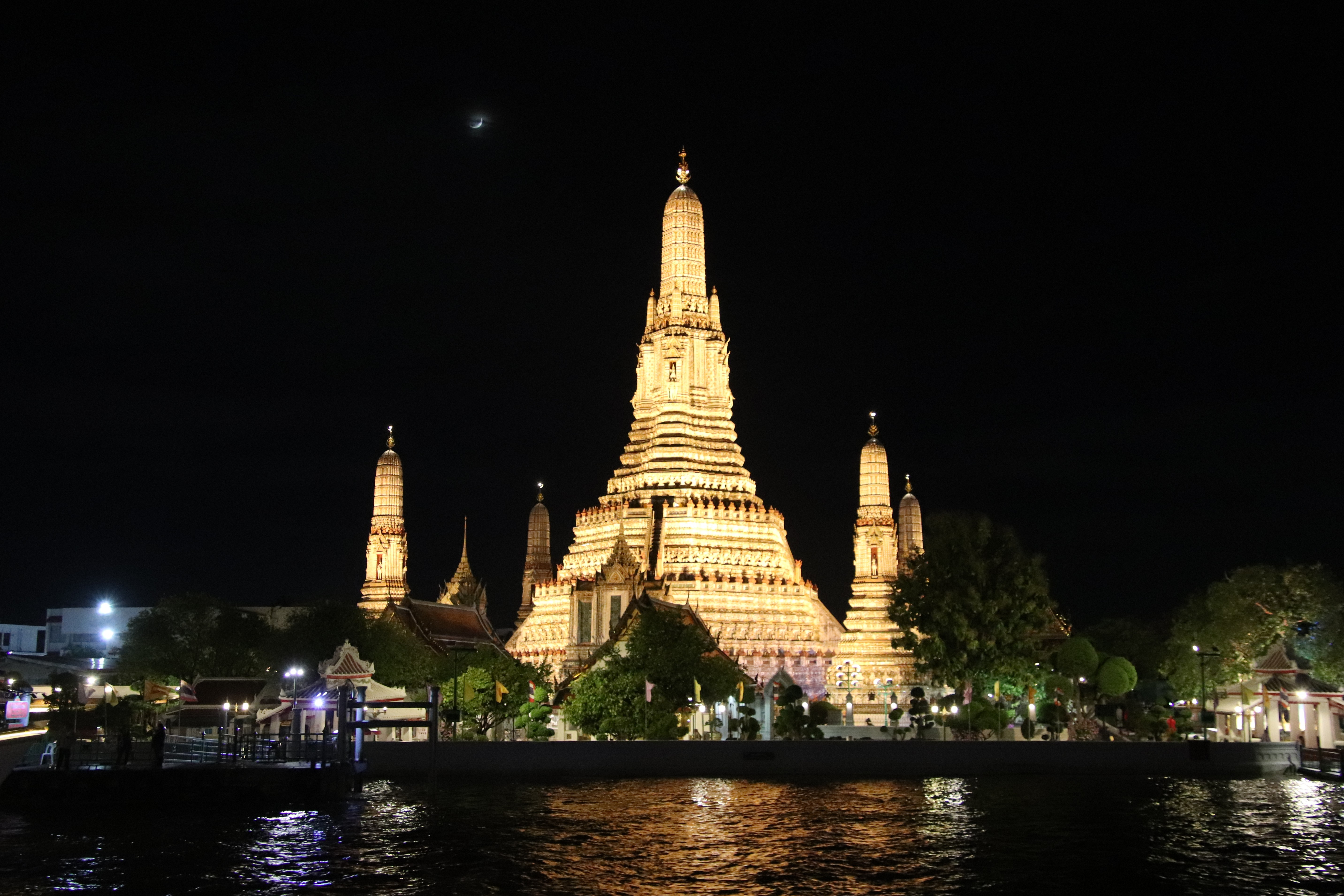 チャオプラヤ川 河畔にあるバンコクを代表する美しい寺院、夜はライトアップされます。