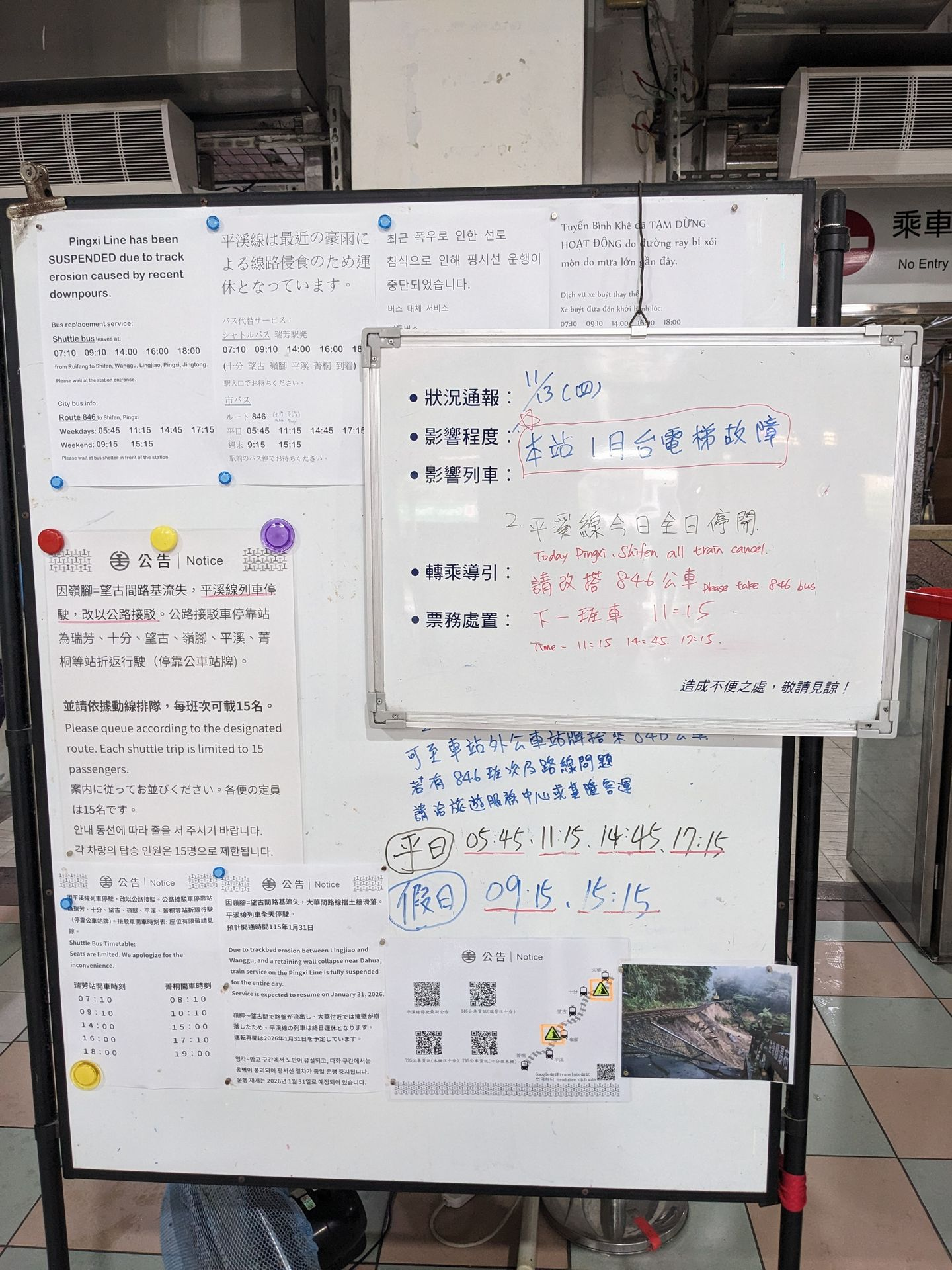 友人とオジサン3人で、十分に行くのを楽しみにしていたのですが、日本からの出発直前に「豪雨のため土砂流出被害で平渓線が運休、代替シャトルバスで運行」のニュースが飛び込んできました。