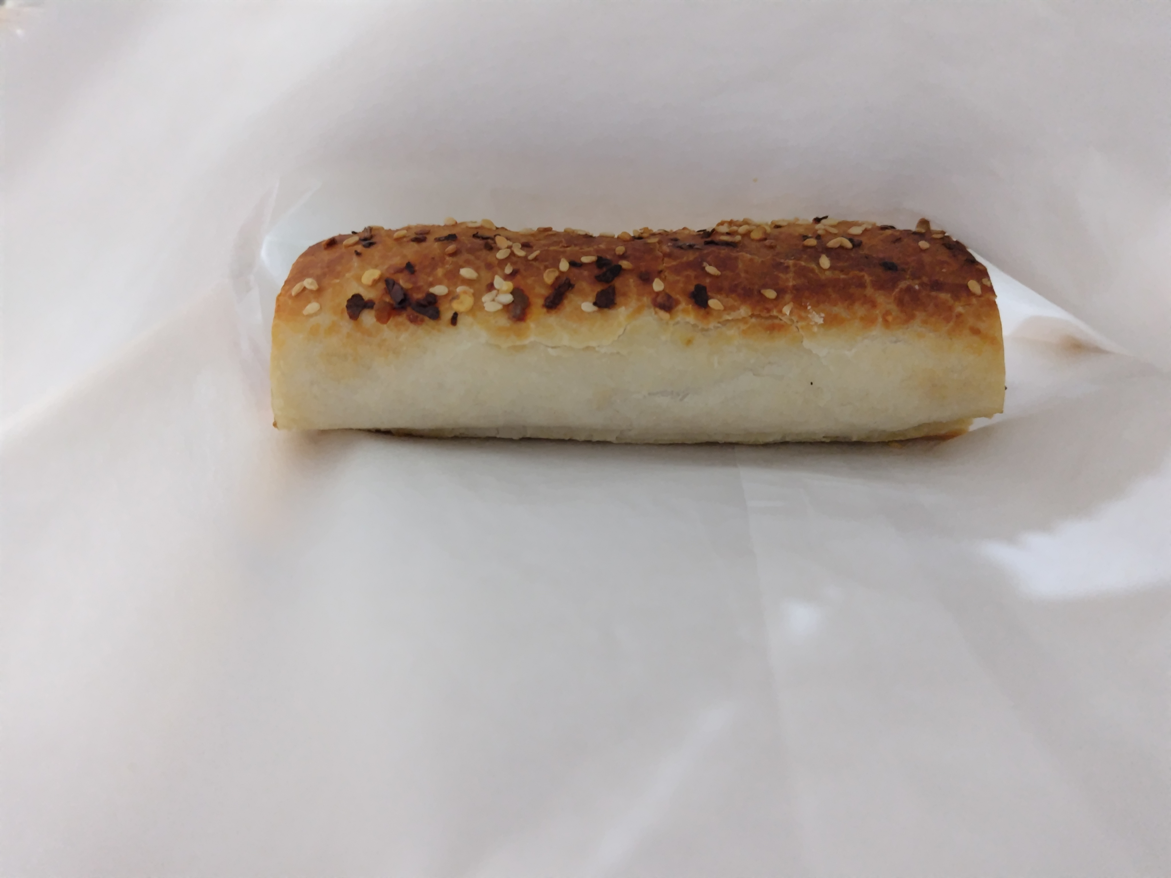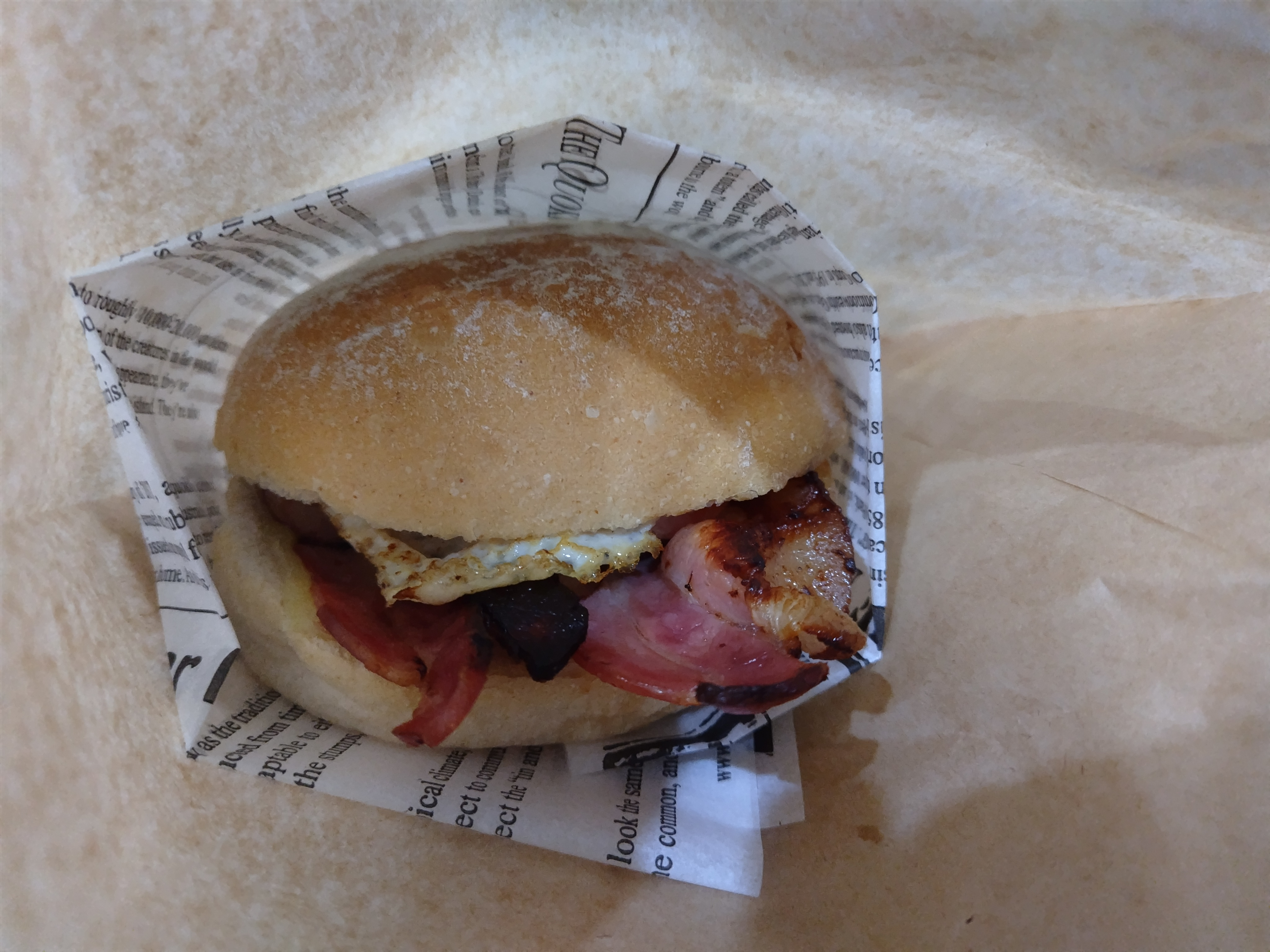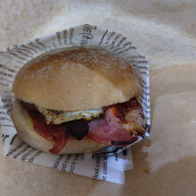 ベーコンエッグサンドイッチ(外観はハンバーガー)やスウィートチリソーセージロールなど暖かいメニューもありました。