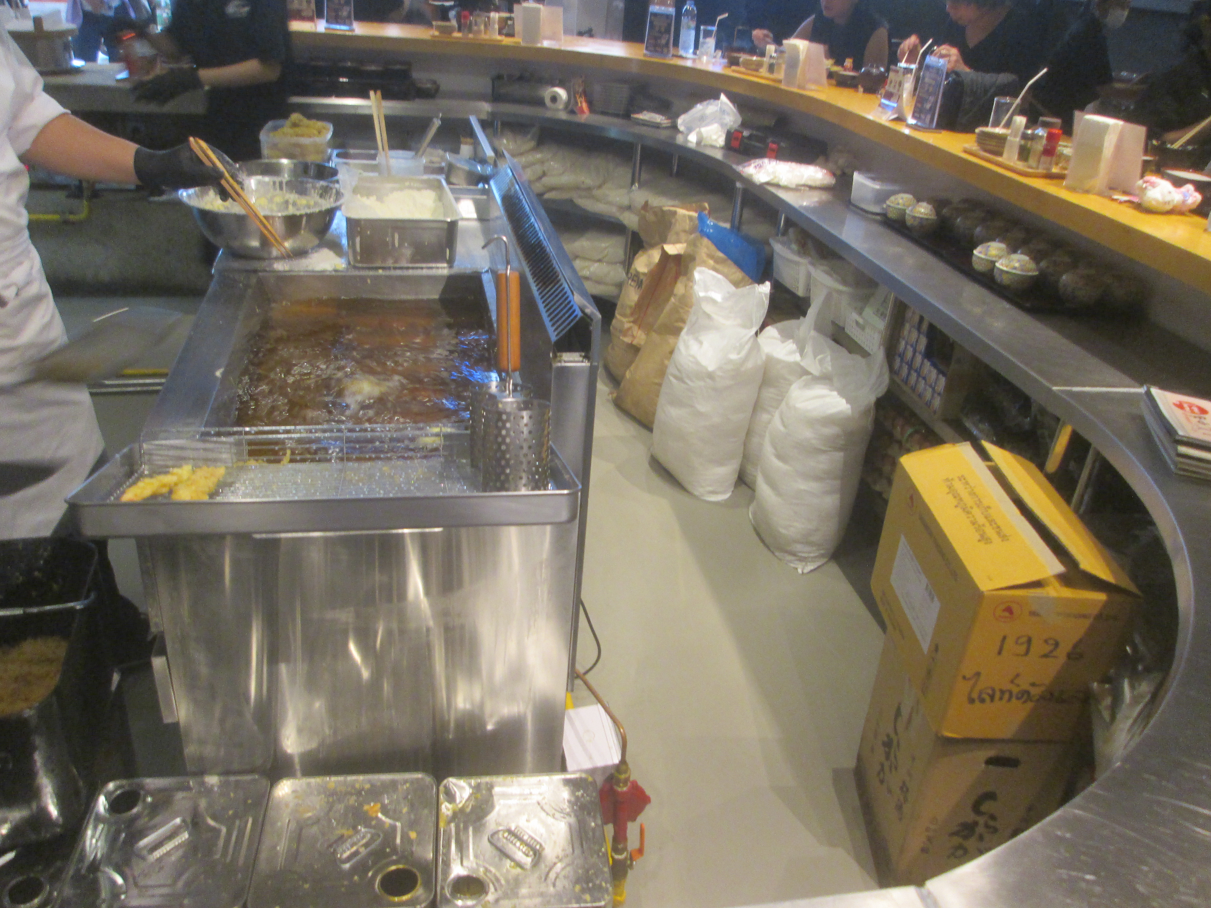 博多天ぷら やまや (ワン・バンコク)で受付が終わると、カウンター席に通されました。厨房を囲むようなレイアウトになっていました。タイ人の料理人さんが上手に天ぷらを揚げているのを見学させていただきました。おそらく、日本で修行されたのだと思いますが、手際良く作っていたのが印象的でした。