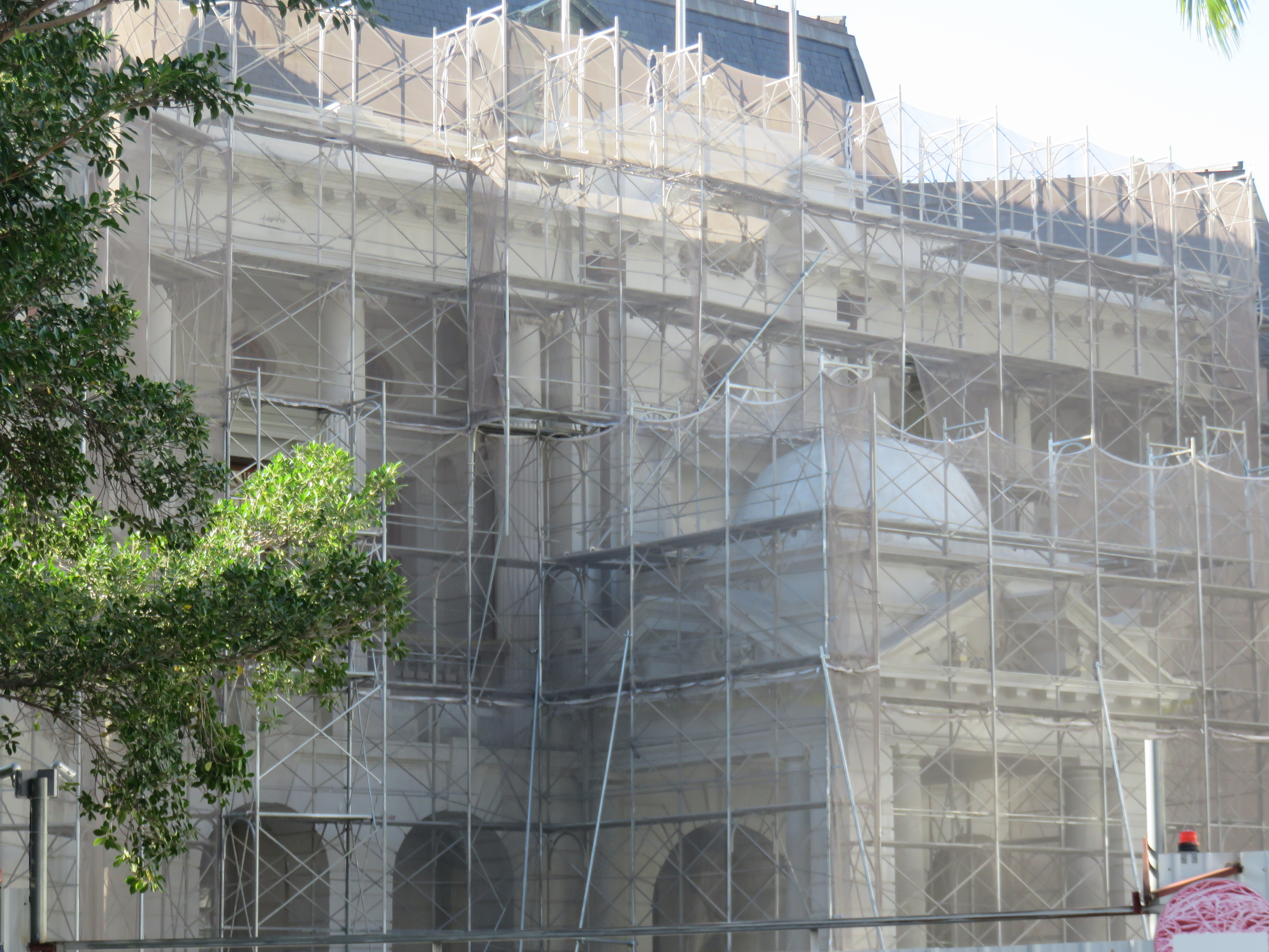 民権路と市府路の交差点に佇む白亜の建物が「旧台中市政府(台中州廳)」ですが、2025年12月現在工事中でした。この建物は、日本統治時代の1913年に建設が始まり、1934年に完成したバロック様式の建築で、現在では国の古蹟として指定されています。