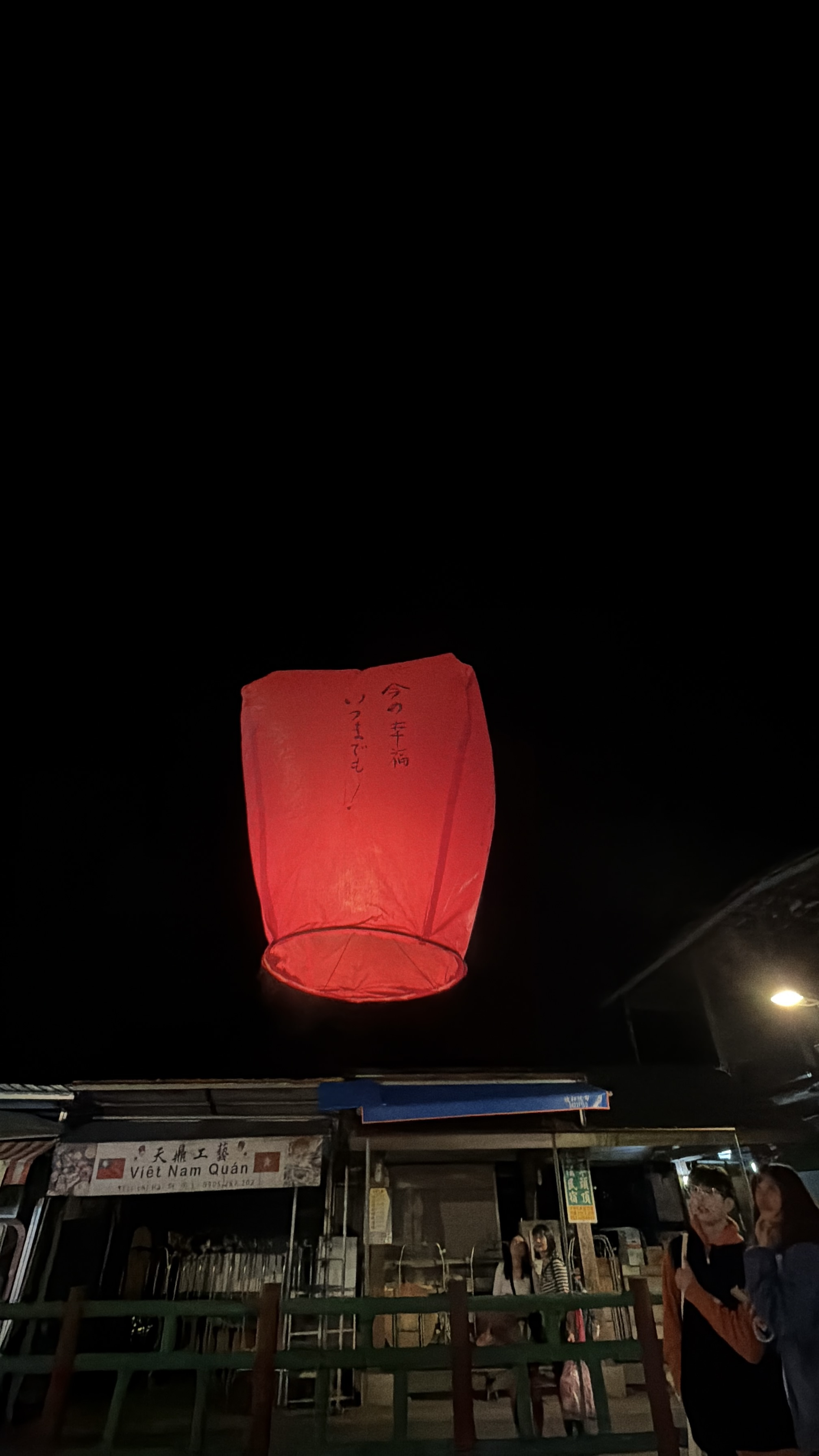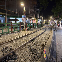 線路の両側には、天燈上げの商店やお土産などの店舗が並びます。