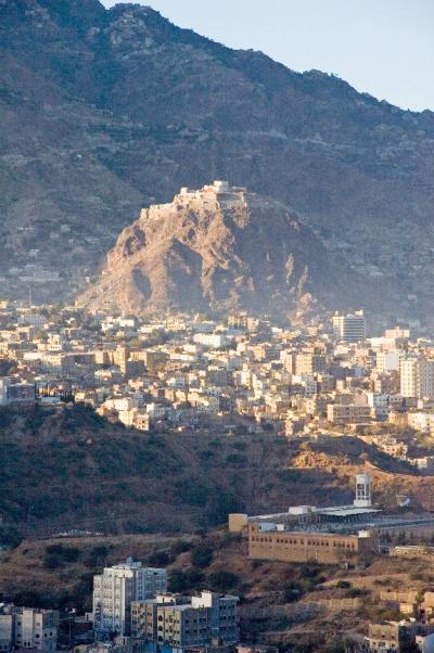 タイズの高台にあるホテルの部屋からの風景きのう観光したアルカハラ宮殿跡がよく見えます