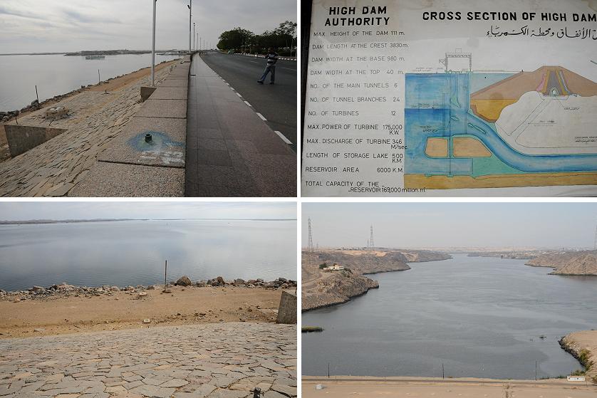 アスワン市内から南へ10kmあまり。ドイツとソ連の協力で1970年に完成したというアスワン・ハイダムは、東京ドームが164個も入る広大さなのだそう。 私たちはルクソールで雇った車でアスワンへと向かってもらい、最後にこのアスワン・ハイダムにも寄ってもらいました。 見学料金は20エジプト・ポンド。ダムのたもとにゲートとチケット売り場がありました。 幅が3600mもあるダムの上には左上の画像のように車道も付いているので、そのままダム真ん中あたりの駐車場+展望台まで車で行けます。 展望台では左下の画像の上流側(ナセル湖側)も、右下の画像の下流側(アスワン市内側)も自由に見て歩けますが、テレビ・カメラ、ビデオ・カメラでの撮影は禁止されています。 普通のカメラはOKですが、ズーム使用禁止。 私は最初それに気付かず、ズームを使い始めたところで監視の兵士に注意されました。 幸い、画像の提示や削除は求められませんでしたが、皆さんは気をつけましょう。 ダム自体は巨大で驚きますが、眺めとしては平坦な感じであまりフォトジェニックとは言えません。 右上の画像のようなダムの説明書きが地図や図解と一緒に出ているので、見ていくといいですよ。