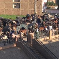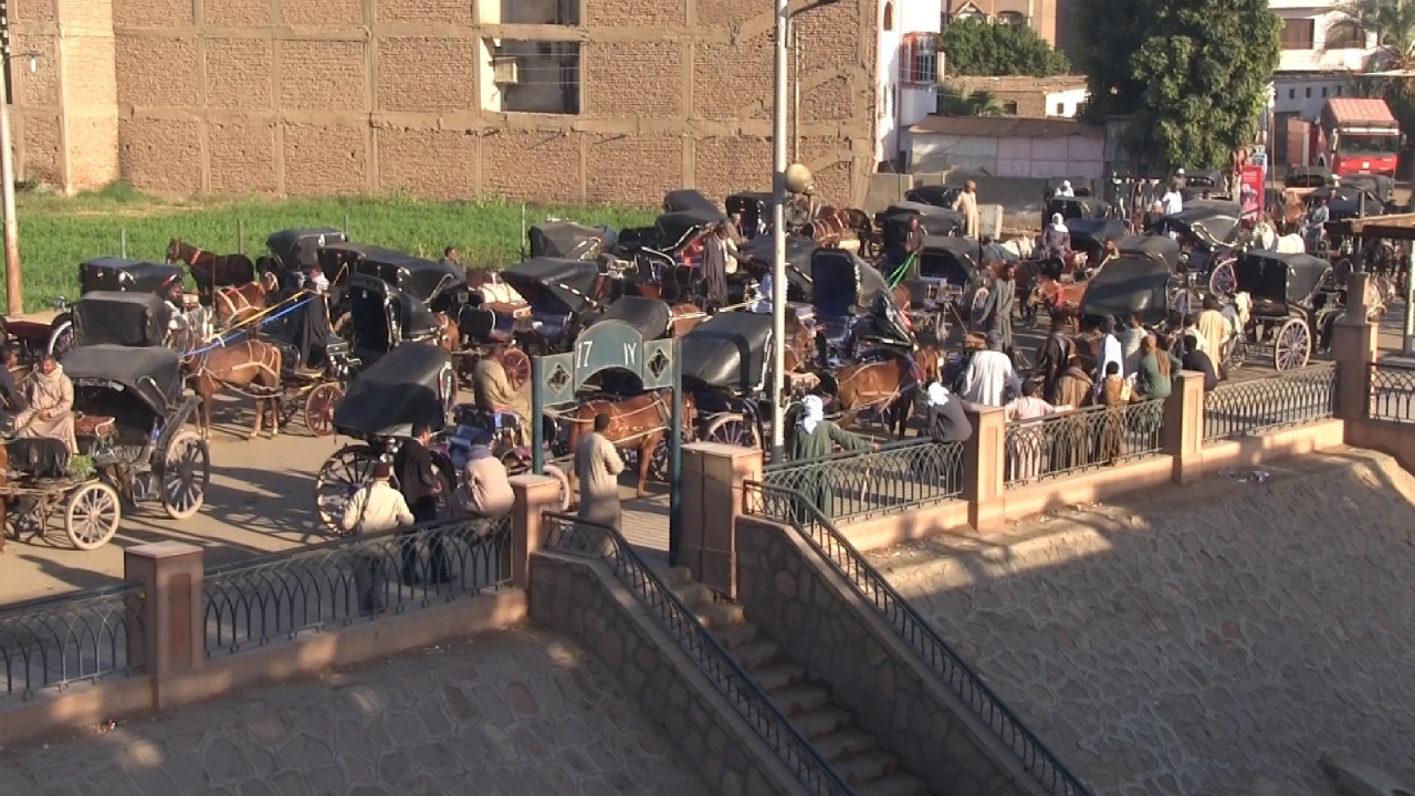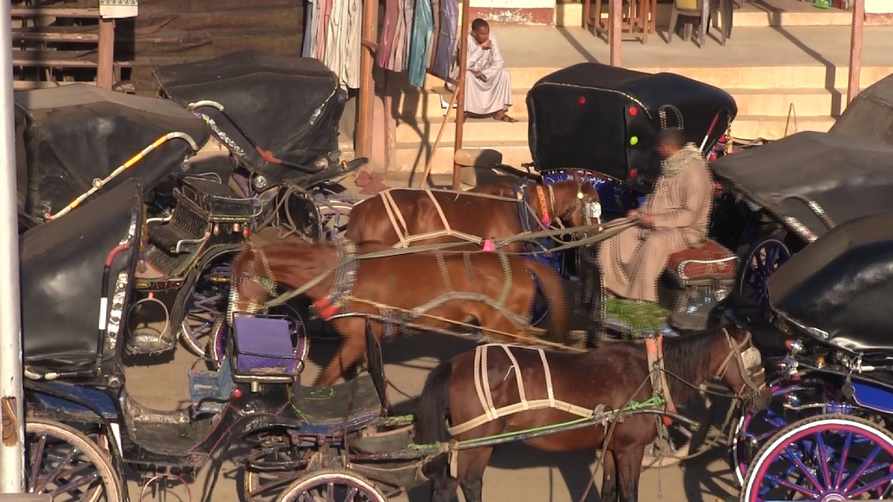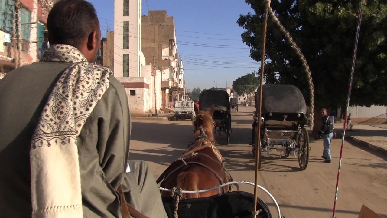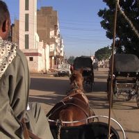 観光地、どこへ行っても物売りの激しい攻勢にややげんなり感を抱いていたが、エドフの西岸に停泊したクルーズ船からは路上に集まった数多くの馬車にまず驚く。言葉も地理も?、というツアーの一行がここで2人乗りの馬車に分乗してホルス神殿へ向かうのだが、ガイドからの指示を待って馬車に乗ることを厳守するようまずは注意を受ける。僅か10数分の馬車移動だが全員がそろっての移動ではないため、途中現地の馭者との間でどんなトラブルがあるかわからないという。ガイドは馬車の登録ナンバーと乗客名をメモしたのち出発OKとなる。過去にどんなトラブルがあったのかは聞かなかったが、この慎重な対応ぶりにやはり緊張感も…。女性2人組の中には道すがらボールペンなどの物品をねだられ断ると猛烈なスピードで怖かった…、降りしなに記念写真を撮ってあげるとシャッターを切ったのち、チップを要求されたなどの話も耳にした。