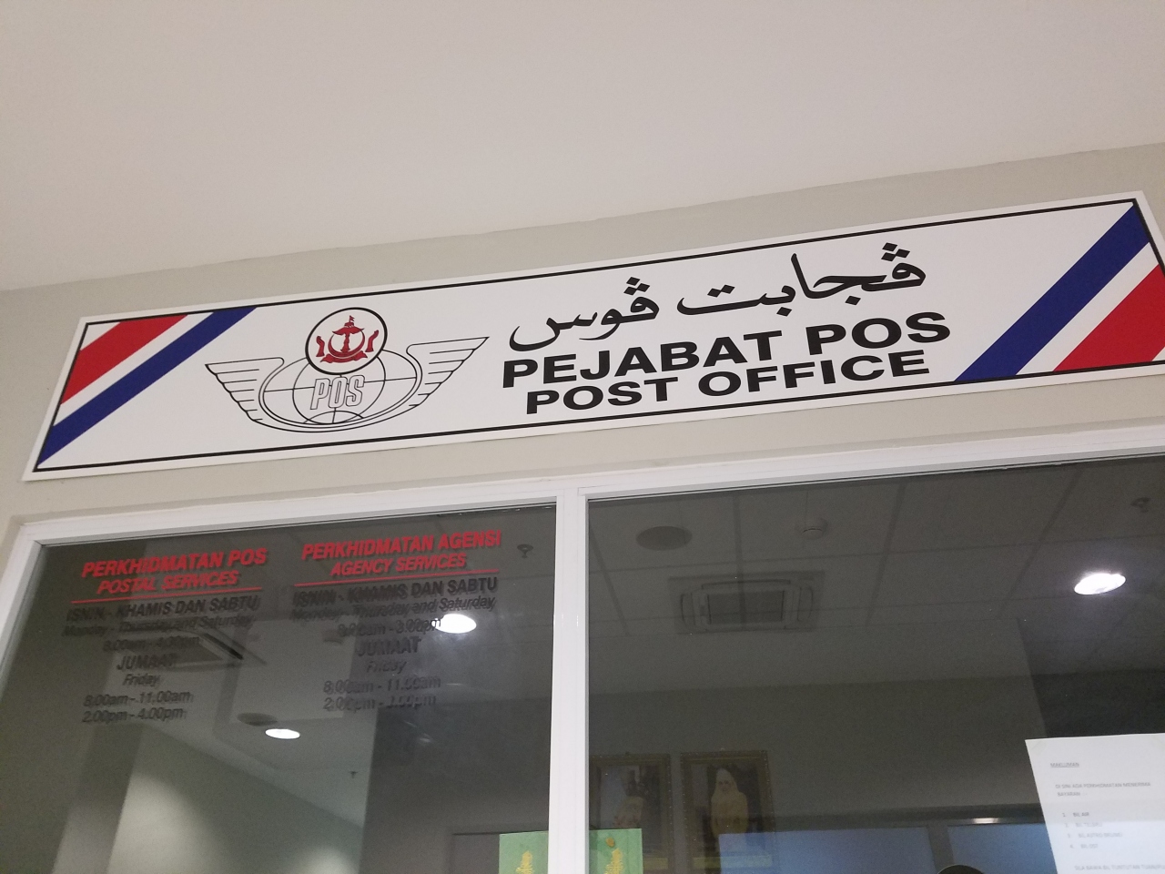 郵便局は写真のロイヤルブルネイ経営のレストランの向かい側の