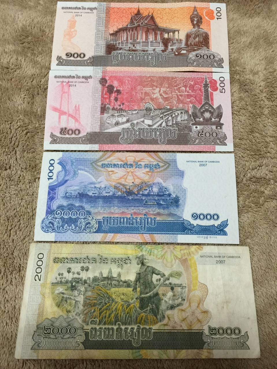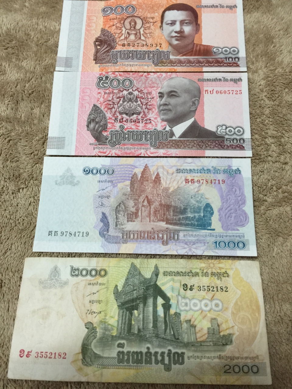 シェムリアップ(カンボジア)では現地通貨リエルと共にUSドルが流通しています。ホテル、レストラン、スーパーマーケット、コンビニ、土産物屋などでは値段表示はすべてドル表示です。例えば0.5ドル、2.2ドル、3.75ドルなど。お釣りはそれに見合ったドルやリエルでもらえます。混ざることもあります。ほとんどの場合1ドル=4000リエルで計算されます(一部のスーパーなどでは4100リエルの場合あり)。なので基本ドルをリエルに両替する必要はありません。ドル表示であってももちろんリエルでも払えます。銀行や両替屋へ行けば1ドル=4050リエルほどで(2016年5月現在)両替できます。大量に替えれば特をしますが札がかさばるのと余った場合の他通貨への両替レートが悪いのであまりおすすめはできません。そこで必要になってくるのがドルの少額紙幣。ジュース1本(0.5~1ドル)買うのに20ドル札を出してもお釣りがもらえるかは疑問です。小さな商店ならまずもらえません。1、5、10ドル札を持っていると買い物しやすいです。100、50ドル札は両替屋で細かくしてくれます(銀行は断られることもある)。逆に10、20ドルを少しずつリエルに替えるのもいいでしょう。両替屋はシヴォタ通りのラッキーモール周辺やオールドマーケット周辺にあります。