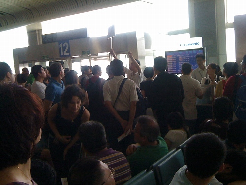 霧が少し回復すると、次々飛ばす飛行機を、なぜか2,3の搭乗口にまとめるものだから、開いた登場口の周りは、別々の飛行機を待つ人たちでまたもや大パニック…