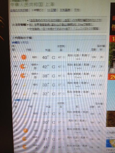 上海の夏は、毎年かなり暑いのですが、今年は例年以上に猛暑となっており、7月に引き続き猛暑の日が続いています。日本とは少し暑さが違って、朝から気温がぐっとあがり35度などザラです。また夜も8時になっても35度くらいのことがほとんど。夕涼みと行きたいところですが、それもままなりません。昼間は昼から午後にかけて40度を記録する日が多く、浦東のビル街では木陰があまりなく、コンクリートの地面からの照り返しがあるために、あり得ないほどの暑さです。