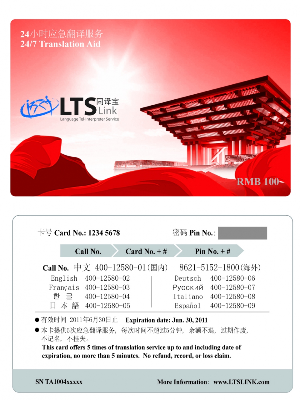 後インターネットで調べたが、こういうカードは中国だけではなく、海外でも使えるし、多種類言語の電話通訳サービスを提供しているようです。海外旅行の人にはとてもいいものだと思います。ホームページはwww.ltslink.comです。そこでカードの詳しい情報があります。
