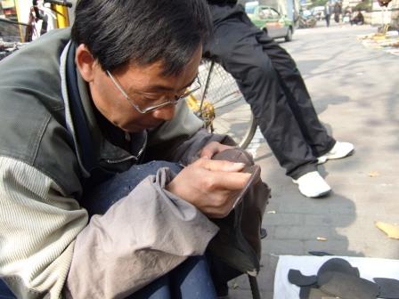 上海賓館の前の歩道で、知人と待ち合わせたら30分遅れるとの電話。歩き回ったあとで靴がドロドロだったので、路上の靴磨きのおじさんに値段を聞くと4元とのこと。写真の男性だが、真面目そうでもあり、頼むと靴を脱いでスリッパに履き替えろという。いつもは履いたままだが、急がないし素直に履き替えると、良い調子で磨き上げ、終了まぎわにお前はここのホテルに泊まってるのかと聞いてくる。。。ここで是と答えればよかったが。。。あとの祭り。。。