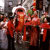 画像は、オープンした服飾デザイン店のセレモニー風景。獅子の口から開業大吉と書かれた布が出ています。