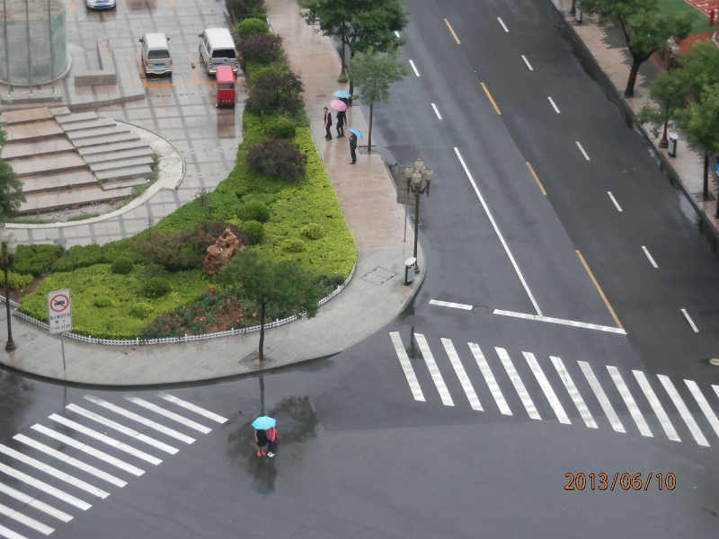 日曜の雨の予報がはずれかと思った午後から降り始めた雨。月曜の朝はまだ雨が止んでいない。おかげで大気の汚れがしっかり落ちたようだ。雨の中でも数百m先のビルがしっかり見える。 -