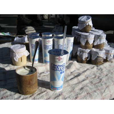 2007年末にチベットに行った時、ヤクホテルから北京東路をポタラ宮方面に向かうと娘熟路まで行く間に自転車屋台で売っています。日本で食べるヨーグルトよりは酸っぱいです。でもおいしいのでラサにいる間は毎日食べてました。2〜3元くらいで、写真のように竹の入れ物に入って売っています。屋台によっては若干値段が違います。食べるのと飲むタイプとあります。どちらもオススメですよ!