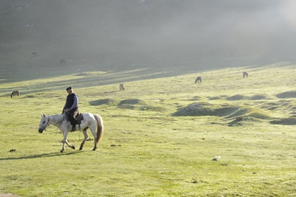 カナス湖を訪れるツアーが泊まるのは湖畔ではなく、緩い谷間になった牧草地。夕暮れには激しいにわか雨が降ったせいもあるんでしょうが、ジメジメとした寒さになりました。