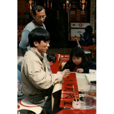 中国に限らず、中国人が多く住む国や地域では旧正月(2005年は2月9日が日本で言う元旦)になると、家々の門口には春聯と呼ばれる赤い細長い紙におめでたい句を書いた物を貼り付けられます。もちろん印刷済みのものの中から選んで買う事も出来ますが、達筆の人に好みの文句を頼んで書いてもらう事も出来ます。