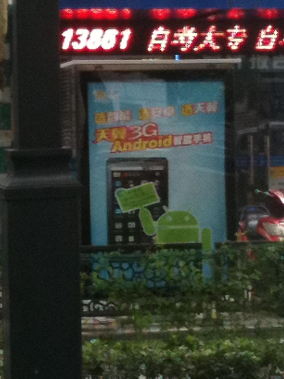 写真のように、上海の街中でもAndroid端末の広告がありますね。ただし、「Twitter」や「Facebook」は、中国国内ではPCからつながりません。当局が接続をブロックしているのです。ただし、携帯電話のパケット通信(海外パケット)経由だと、つながりました。状況は変わるかもしれませんが、チェックしてみてください。