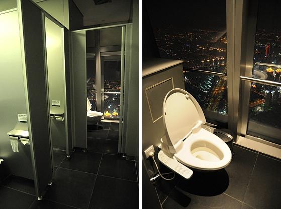 女性用の一番奥のトイレはガラス張りの窓があり、下の景色や夜景を見ながら・・・。(ちなみにドアはガラス張りではありません)