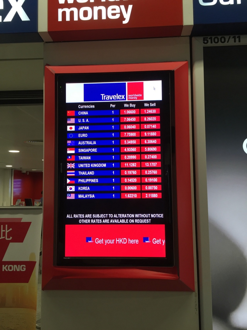 Travelexは、どこの国も空港にあって便利ですがやはり相対的にレートが悪いと感じます。香港の両替えといえばチムチャツイのチョンキンマンションですが、ここに限らず街中の角の両替屋さんでもいいレートだと感じます。ただし必ずレシートと現金が合っているかどうか確認を~。最近(2016年1月)は為替変動も激しいので毎日少しずつ変えたほうがいいかもです。2016年1月17日で0.668(15.1円)位でした。