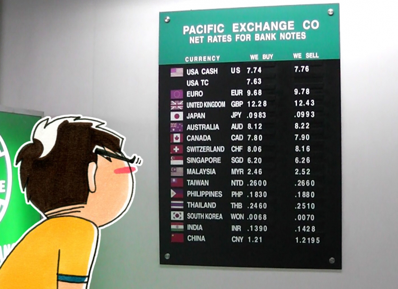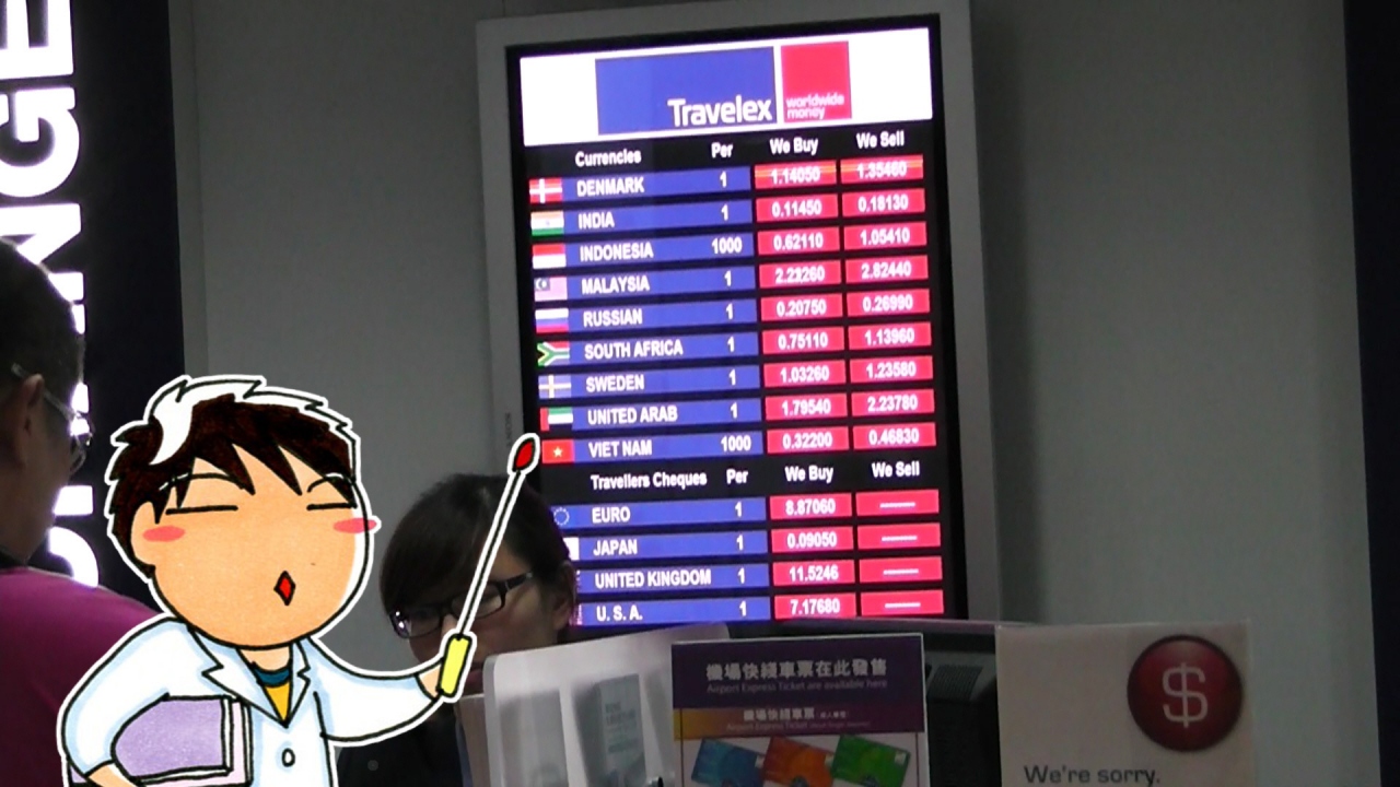 香港空港にある両替所。 We buy 0.0905 1万円が905H$