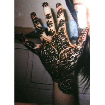 練ったヘナをチューブに入れて手のひらに模様を書き15分くらいそのまま乾燥させて手を洗うと赤茶色の模様が手に染まっています。模様自体は2週間位で消えてしまいます。