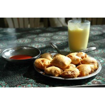 ちょっとスパイスの入った衣をつけた野菜類やPANEER(白く柔らかいチーズ)を油で揚げたフリッター風。お好みで赤いチリソースをつけていただきます。これも食堂で食べると20数ルピー。道端で新聞紙に包んでくれる物だともっと安い。