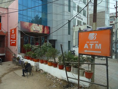 ★インド アグラ インドのATM そう、インドは、信じられないほどハイテクな世界と、信じられないほどアナログ的な、アニミズム的な世界とが混とんとしています。実際、インドのお店は、二分されていて、超高級か、超格安か、です。ほかの国では、観光客用のお店と、地元の人用、というように分かれていることはありますが、インドでは、そういうわけではなく、インドの人たちのなかで2分されているようで、ちょっと複雑な気分でした。