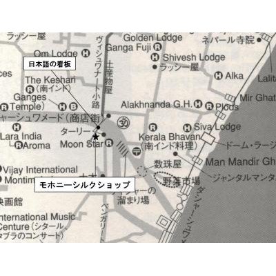 「モホニーシルクショップ」は、奥さんが日本人のインド人ムケが経営しているシルクショップです。この店には、2006年3月に行ったのですが、日本人が結構いて、とても居心地の良い店でした。僕はバラナシに滞在している間、この店に毎日行き、いろいろな人と喋ったり遊んだり、またシルクの本物偽者の見分け方とかも教えてもらえました。シルク以外にも、Tシャツやサリーなどもあるので一度行ってみるべきだと思いますよ!場所は、ちょっと分かりにくいけど、さがしてみてくださーい。ダシャシュワメート通りからちょっと中に入ったとこ。。この店の雰囲気はホントに最高でしたー☆