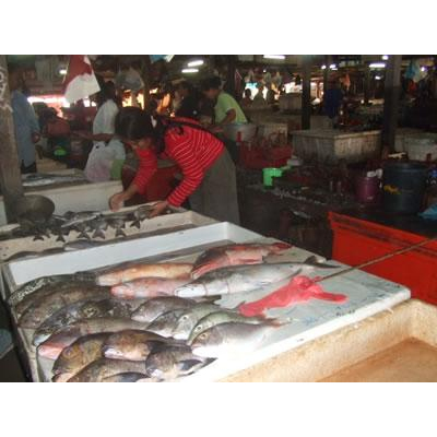ビーチ沿いのシーフード屋台が有名なジンバラン。写真はそのジンバランにある魚市場の様子。市場の狭い通路の両端には所狭しと、魚介類がならべられ、業者から一般のお客様までローカルの人達でごった返しています。タイやらエビ、ロブスター、カニ、イカなど、また見たこともないような熱帯魚のような魚まで。