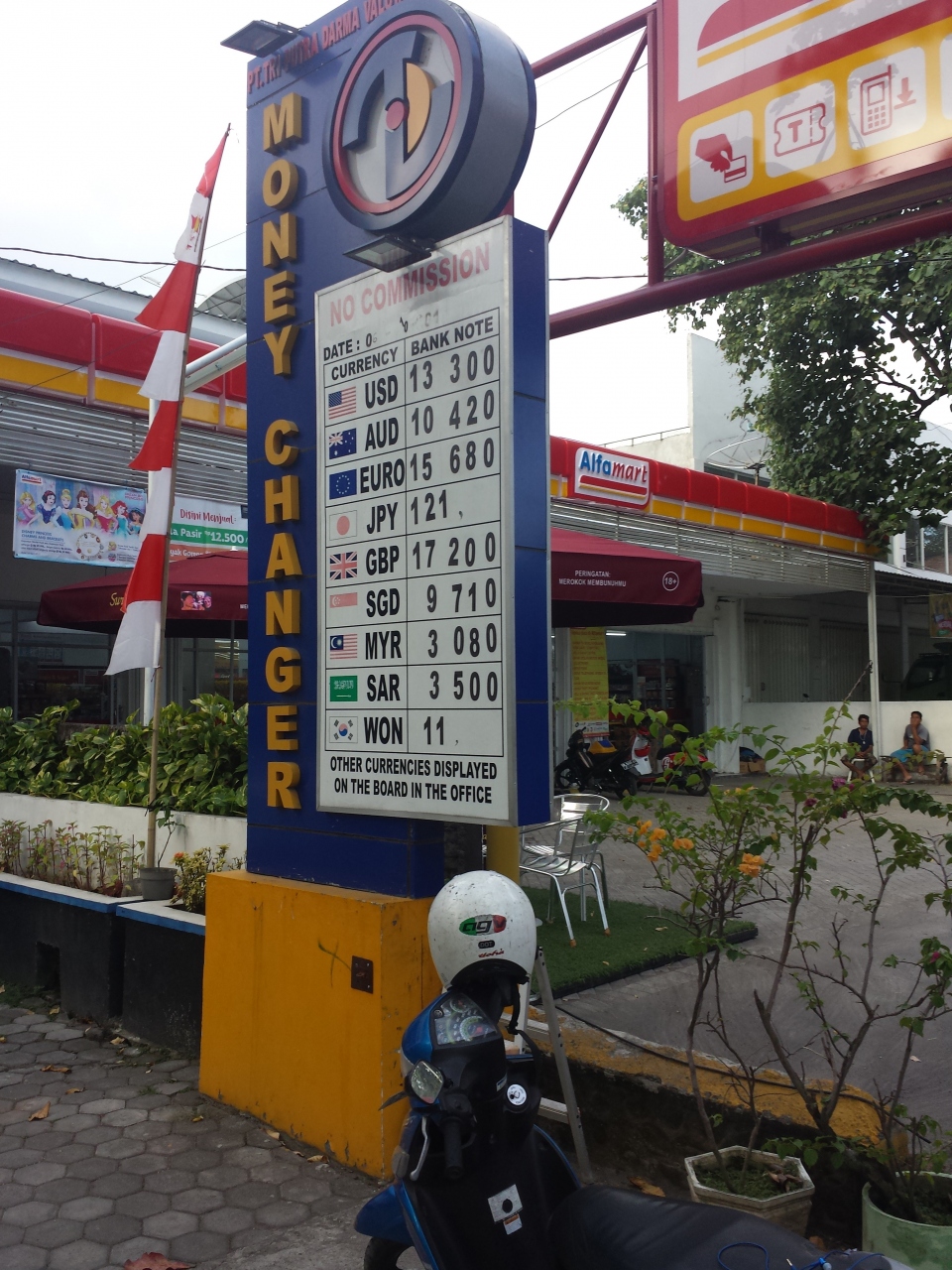 ロンボク島滞在時ではマタラム市内のAuthorized money changer という両替所で両替しました。ロンボク島では両替所がそれほど多くないので、宿泊した宿の女将さんに教えてもらったのがここです。非常にきちっとした対応でレートもそこそこでした。空港で両替するよりもお得だと思います。