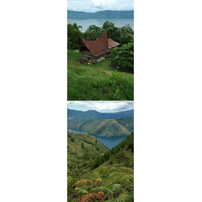 上の画像は北回りの道の途中のバタッ建築の民家があるトバ湖風景、下の画像は南回りの山中から見たトバ湖風景