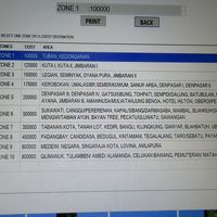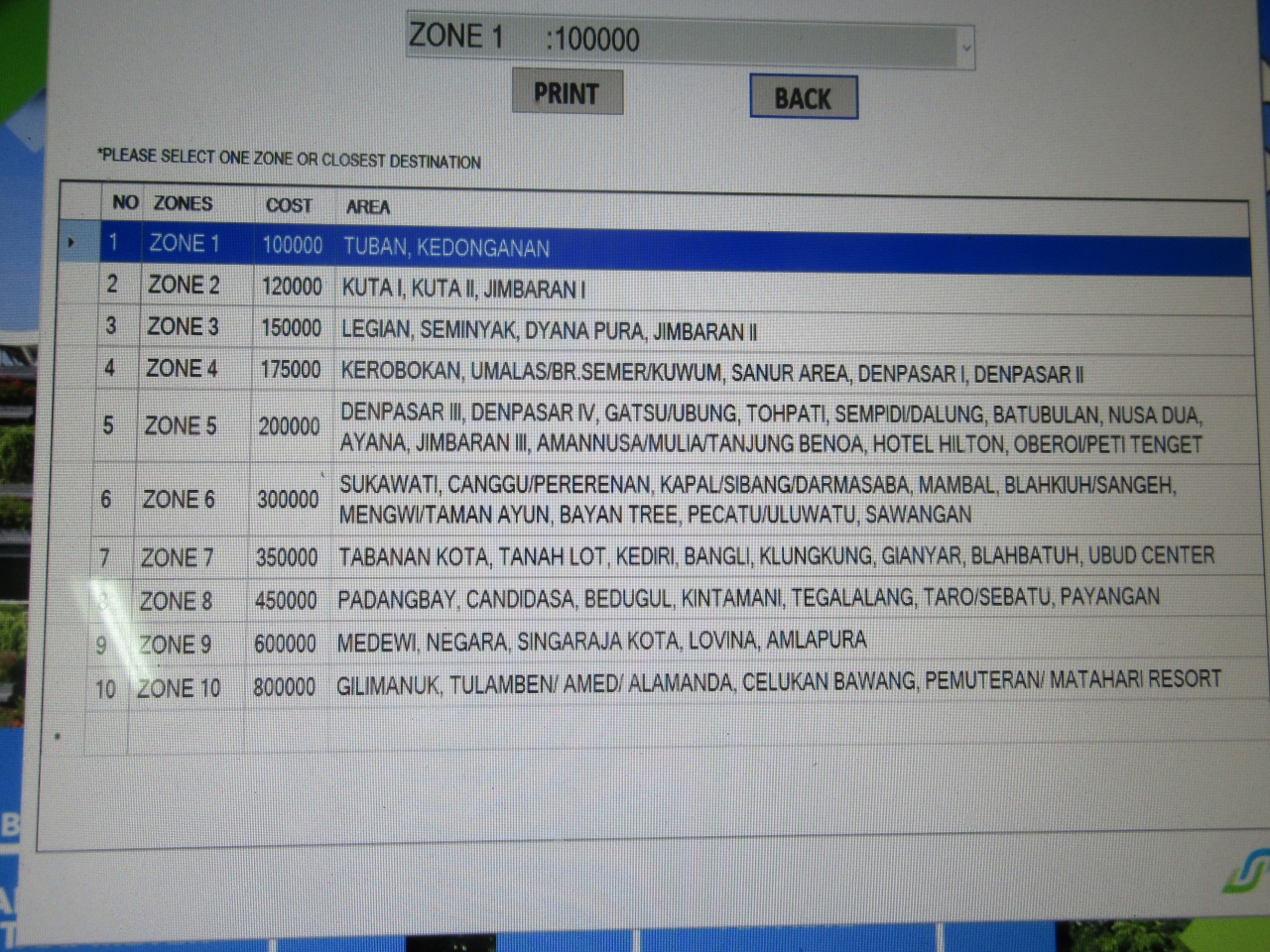 空港タクシーの2017年12月末の最新値段表(ただし国内線出口)です。明朗会計できる機械が12月から導入されています。自分で操作します。同じ頃に国際線からタクシーを使った方で、少し盛られた(笑)話も聞きましたので、どうしても交渉したくない方はノボテルホテルの側を通ると国内線出口まで徒歩5分かかりませんのでお試しください。国際線もそのうち機械が導入されると思いますが。あと空港敷地外まで歩いてブルーバードタクシーを拾う方法ですが、思ったよりクタ方面(レギャン、セミニャック)に渋滞があります、もしかすると定額の空港タクシー方がいいかも。雨季で大雨じゃんじゃん降りだったら敷地外まで歩くなんて(^-^;できませんよね。