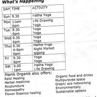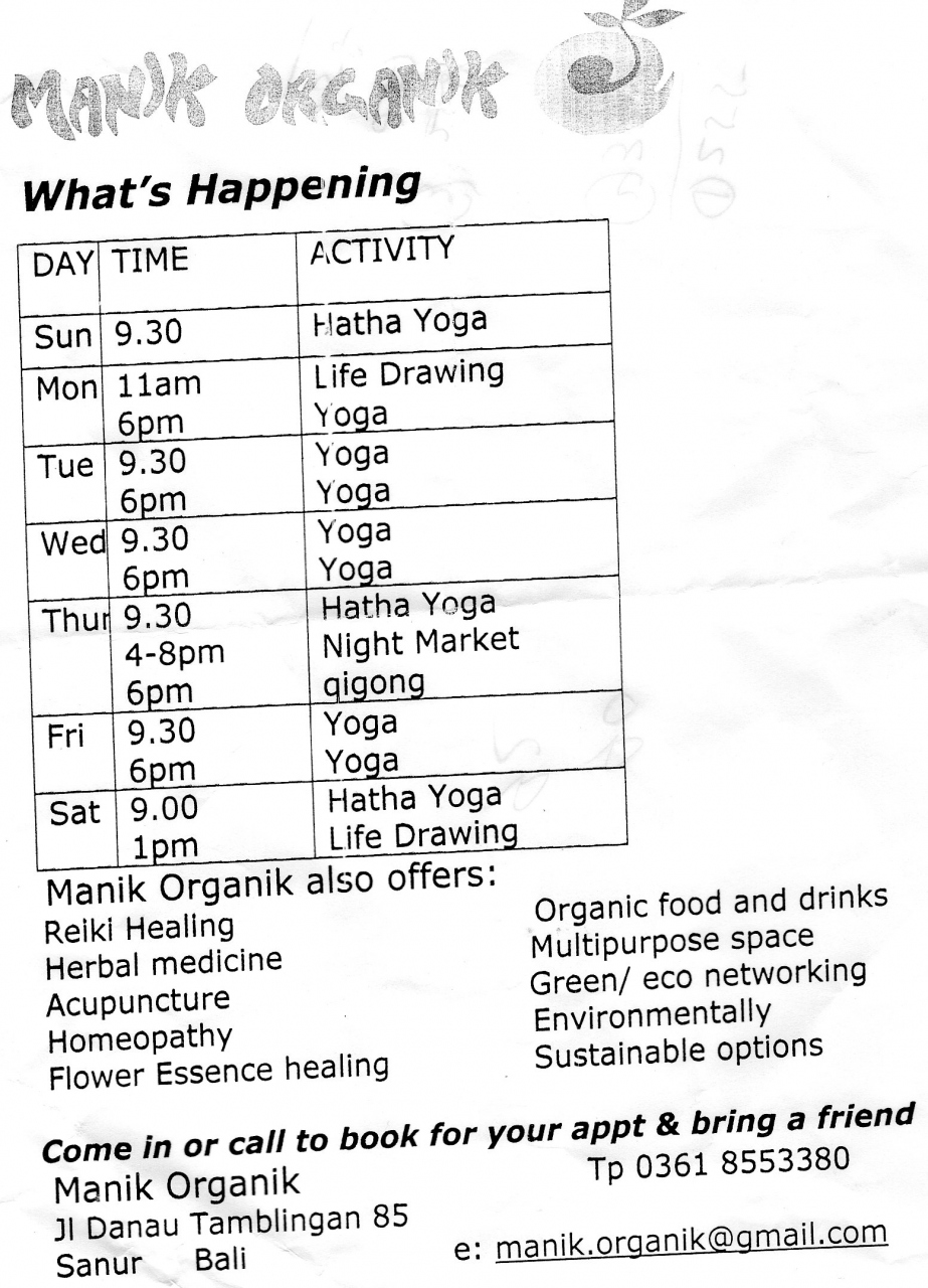 サヌール、タンブリンガン通り沿い、ハルディスとハイアットの中間地点くらいに所在するオーガニックショップ&カフェの「マニッ・オーガニック」2Fで、ほぼ毎日ヨガ・プログラムが行われています。海外でこのようなヨガに参加するのは初めての経験ですが、参加してみました。