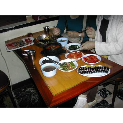 バスがみやげ物店に着くと集合時間をいって中に入れられる。いちおう入り、ころあいをみてすばやく外に出た。行く先は、バスを降りる前から窓越しに物色していた裏手に見つけた食堂。そこで持ち時間をいってすぐできるものをオーダー。事情を察してくださった店のひとは、本当にすばやく韓定食を運んできた。オンドルのきいた座席であたたかい食事。