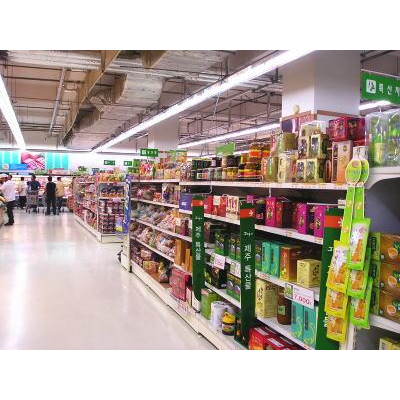 レジは1Fにしかありません。買い物カート(1コイン要)もカゴも1Fで確保し、地下へエスカレーター(階段のないタイプ)で降りましょう。地下に下りれば全面食品売り場!韓国海苔特設コーナーもあります。おばはチャンジャを量り売りで購入していました。(多分腐らせずに持ち帰ったはずです・・・。)