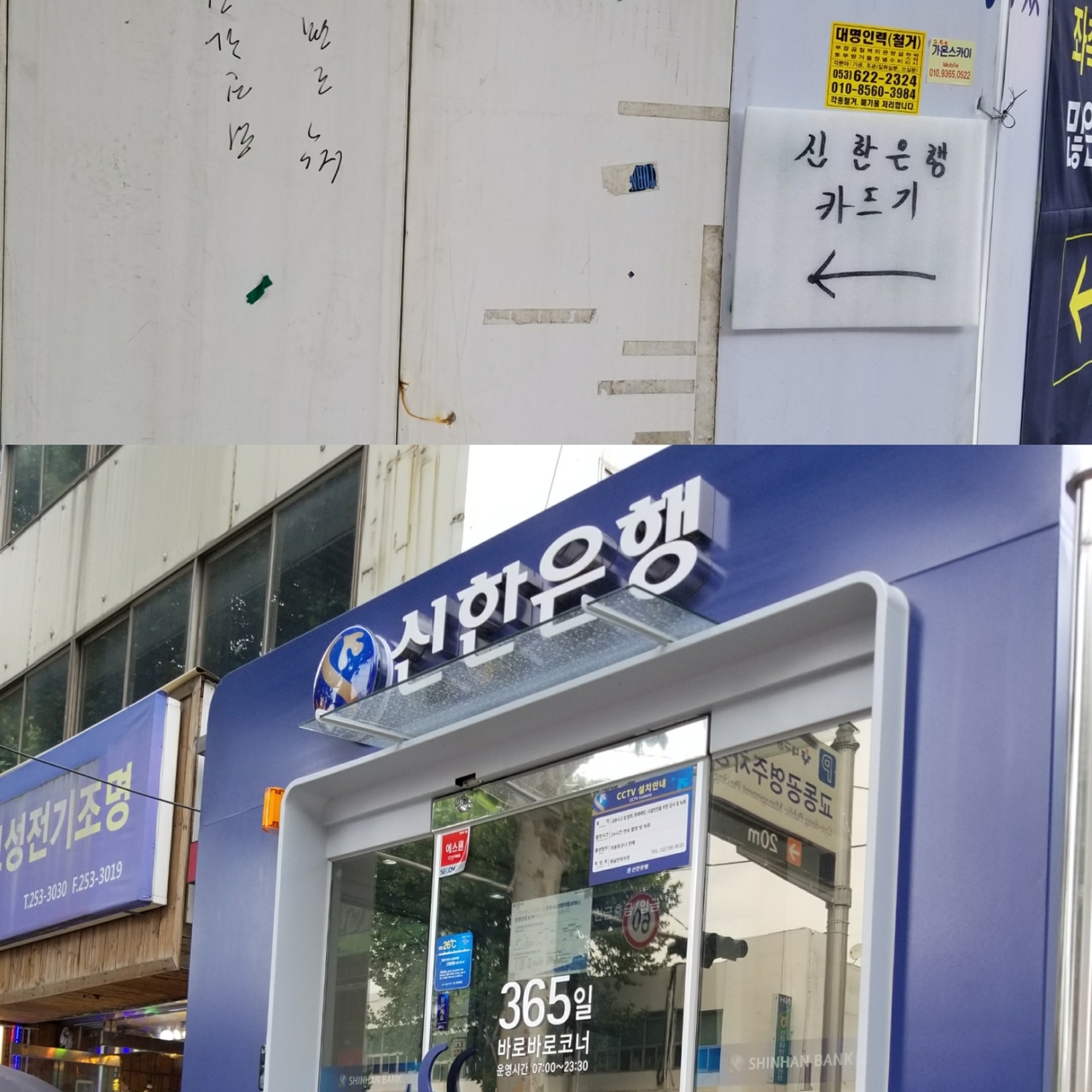 工事中の壁をよく見ると手書きで新韓銀行こちらみたいな