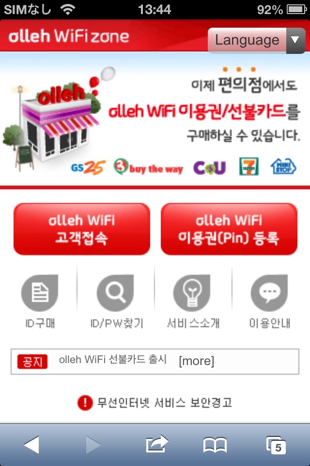 インターネットを開くとOllehWi-Fiの入力画面が日本語ででるのでそこに